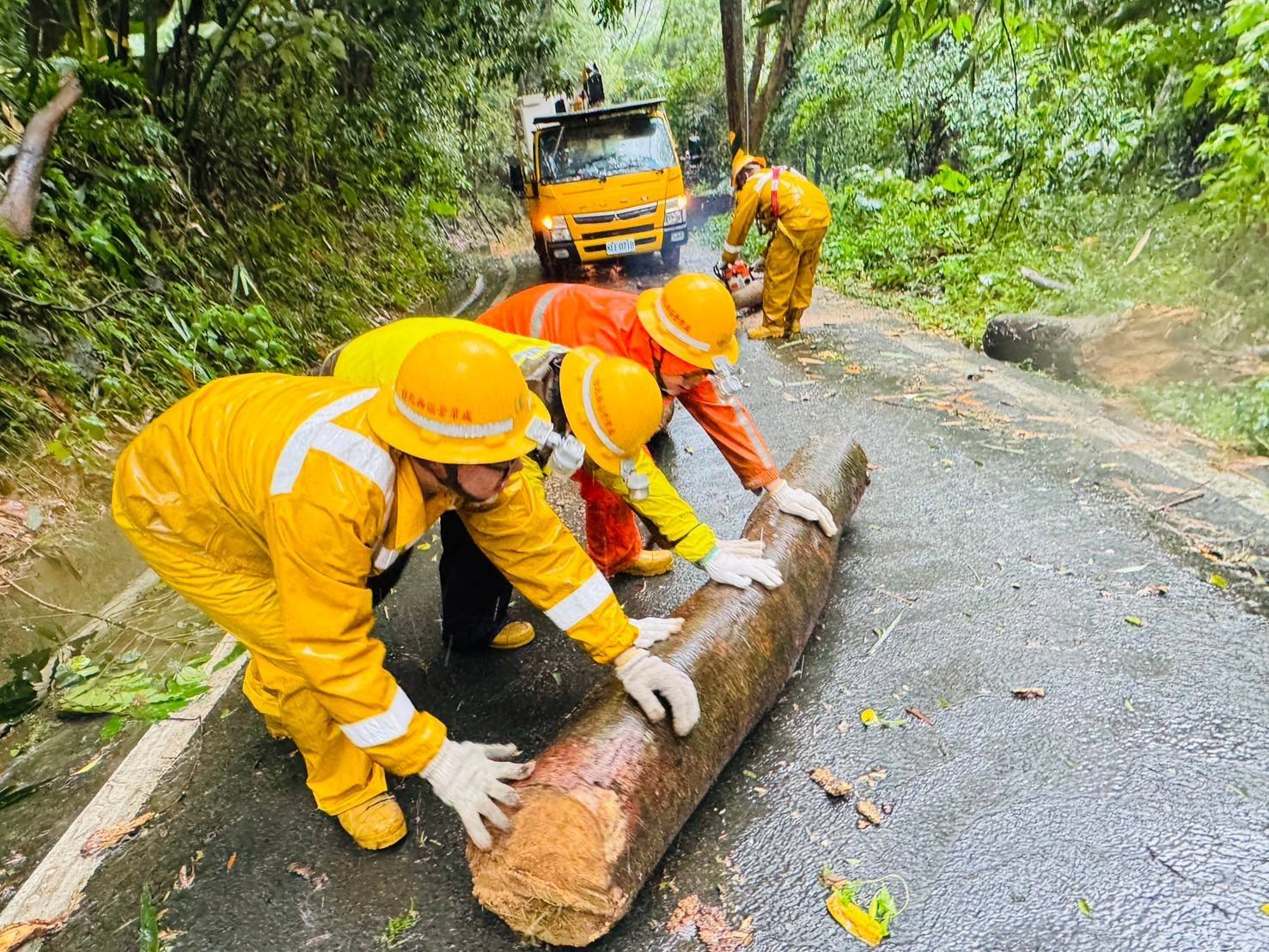 ▼圖說:台電人員冒著風雨在新北樹林區移除傾倒樹木。(圖/台電提供)
