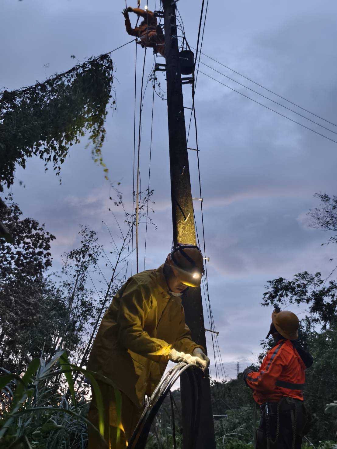 ▼圖說:康芮颱風帶來強風豪雨造成新竹湖口鄉高壓斷線,台電人員入夜後仍積極搶修。(圖/台電提供)