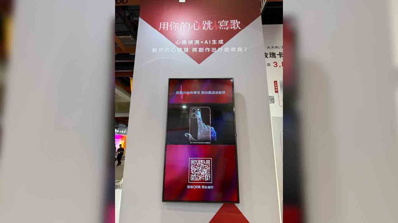 吸引參觀民眾目光的,還有「用心跳寫歌」,使用者拿手機掃QR CODE後,用相機鏡頭偵測心跳,選擇場景,例如工作,AI即會自動生成一首貼近你「心聲」的歌曲,記者現場實測,前後不到1分鐘,即可下載專屬歌曲,相當有趣。(如上圖/記者李錦奇攝影)