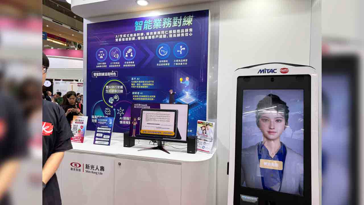 新光金旗下的新光人壽,也秀出與神通資訊科技公司合作開發的AI智能業務對練程式,透過虛擬客戶,提供模擬對話練習,業務員可以選擇難易度,練習與客戶對話,幫助新進業務員提升能力(如下圖,記者李錦奇攝影)。