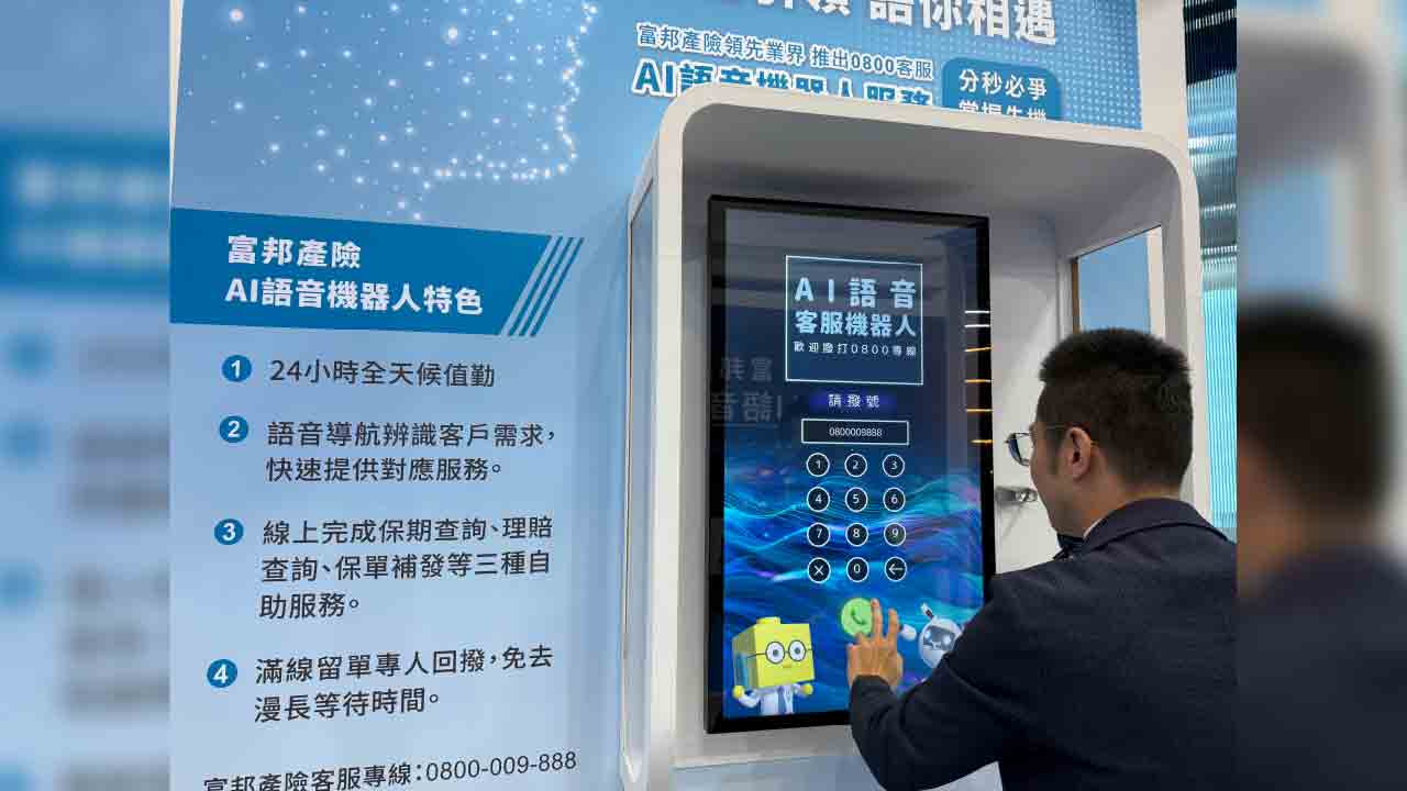 富邦產險特別在展場設置客服電話亭,讓民眾親自體驗AI語音客服機器人的便民服務。富邦產險協理邱振淵指出,該服務去年導入以來,目前AI接聽電話占比已經達到5成,其餘一半是真人客服。