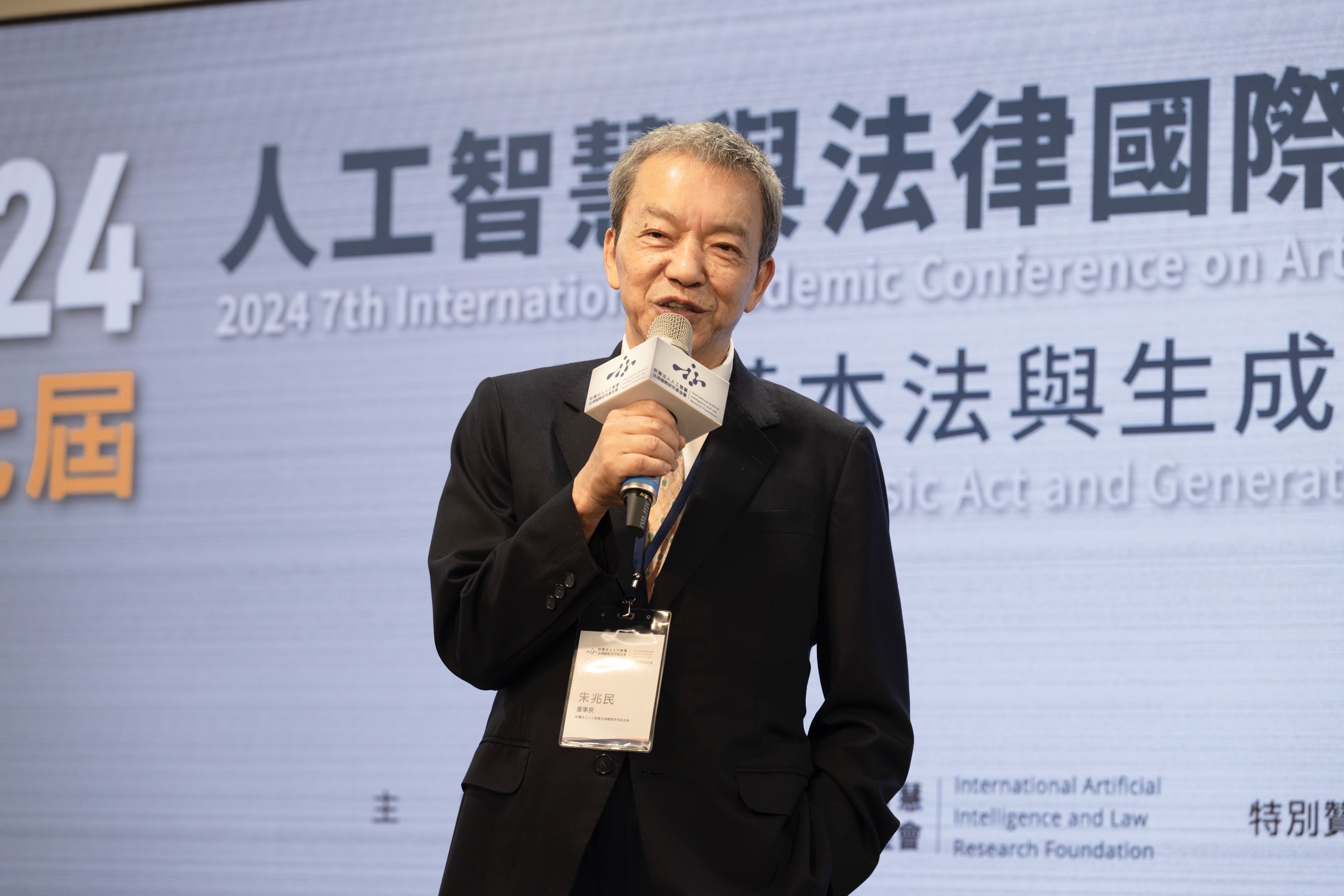 圖說:人工智慧法律國際研究基金會董事長朱兆民,為2024第七屆人工智慧與法律國際學術研討會引言表示,AI發展是未來趨勢,法律也必須隨之興革。