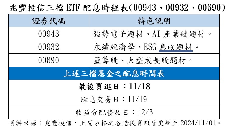 兆豐投信旗下三檔ETF即將同步除息囉!包括兆豐電子高息等權(00943)初估要配發0.15元,維持成立以來連續3個月同一配息水準;兆豐永續高息等權(00932)則要配發0.52元、兆豐藍籌30 (00690)要配發0.8元,除息交易日都是11月19日,想要參與領息的投資人,最後買進日都是11月18日,就能在12月6日領到錢。