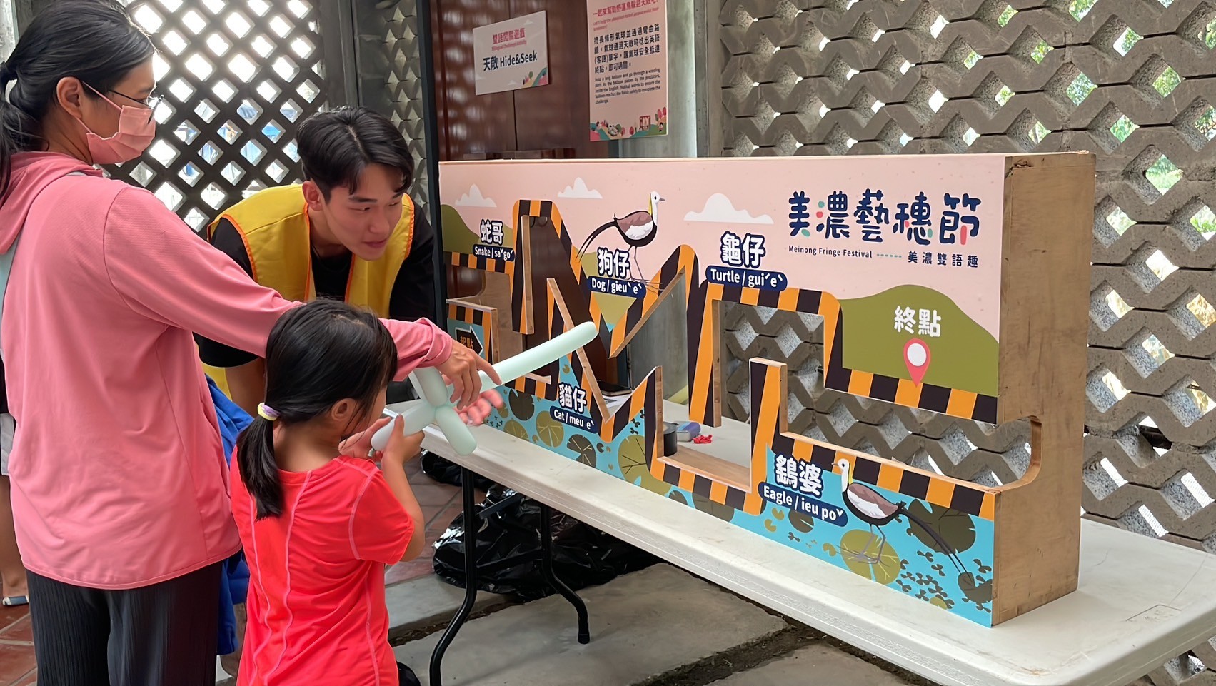 為推廣客語和英語的創意體驗,活動現場設有雙語友善攤位與闖關遊戲,增添了豐富的互動元素。遊客可以在「美濃水圳粄條」和「伍棧樓花生糖」攤位挑戰客英雙語趣味繞口令,成功完成後還能獲得草仔粿和限量花生糖作為獎勵。此外,還有彈珠檯等傳統遊戲讓大人小孩都玩得盡興。遊客只要以英語和客語說出「早安、謝謝、對不起」及自我介紹,即可領取龍鬚糖,以及由「嘉奇手感烘焙」和「Mandy時尚」準備的小禮物。主持人還現場教學,鼓勵大家勇敢使用雙語,增強語言能力。每完成一項以「美濃湖水雉」設計的生態教育闖關任務即可在闖關卡片上蓋章,集滿印章即可兌換小禮物,吸引了許多家庭一起參加,讓孩子從遊戲中學習語言、文化和生態知識,度過難忘的親子時光。