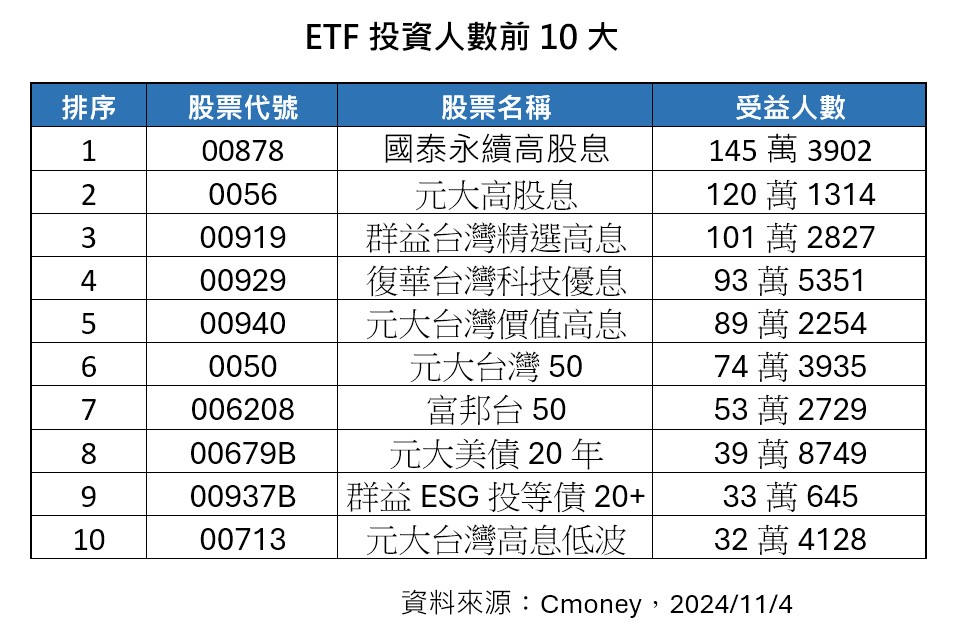 00878受益人逾145萬創新高!全台投資人數之冠 十大人氣ETF一表掌握
