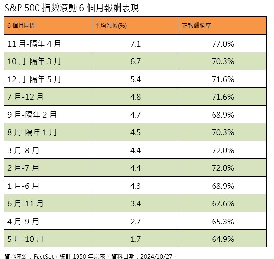 S&P 500是美股代表指數之一,也成為美股強弱指標之一。法人統計1950年至今,S&P 500指數滾動6個月的報酬表現,發現每年11月到隔年4月,正報酬機率接近八成,平均上漲7.1%,是投資效率最高的波段;相對地,S&P 500指數表現最弱的波段出現在每年5月~10月,平均只上漲1.7%,上漲機率只有64.9%。