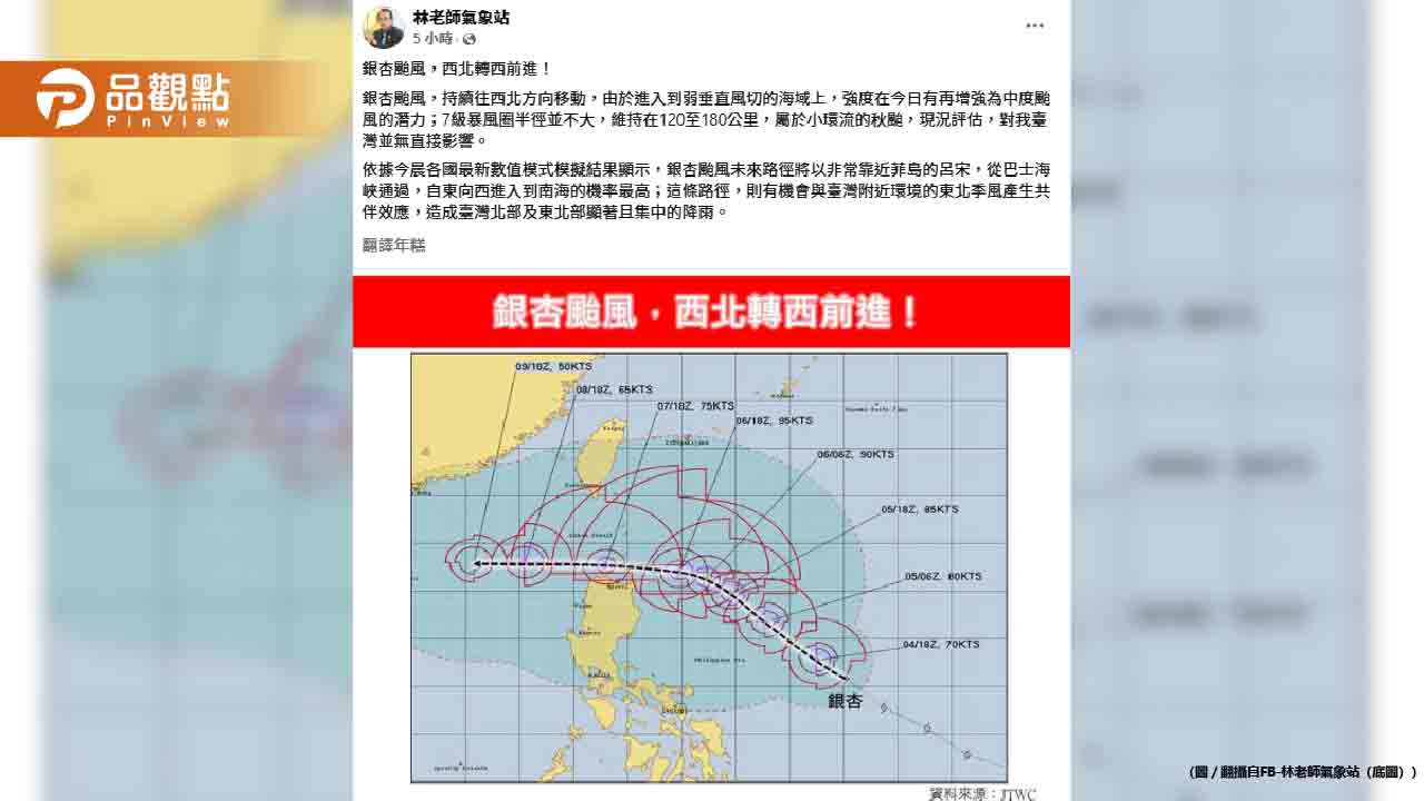林得恩提到,依據今晨各國最新數值模式模擬結果顯示,銀杏颱風未來路徑將以非常靠近菲島的呂宋,從巴士海峽通過,自東向西進入到南海的機率最高。他認為,這條路徑有機會與台灣附近環境的東北季風產生共伴效應,造成台灣北部及東北部顯著且集中的降雨。