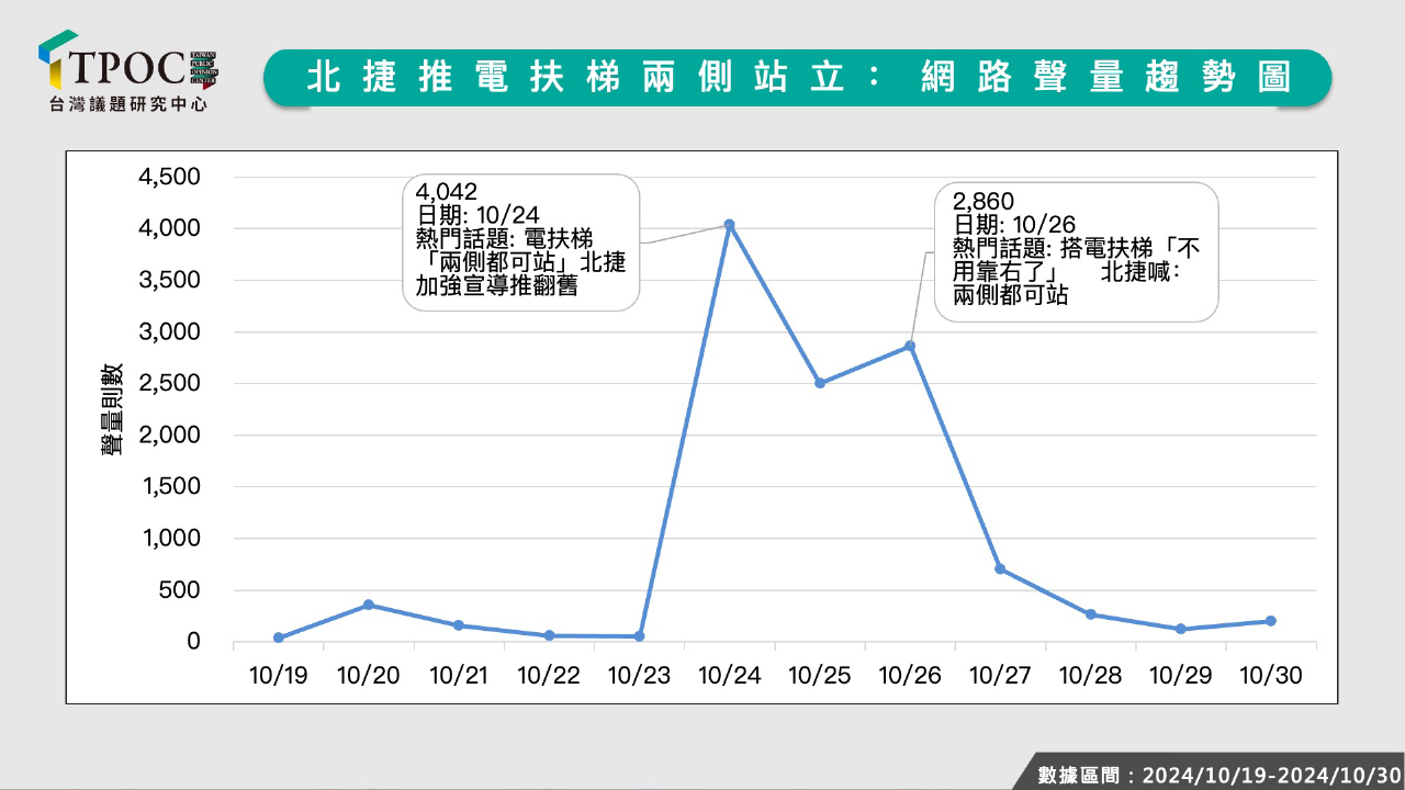 為了瞭解網路正反意見風向,TPOC台灣議題研究中心透過QuickseeK快析輿情資料庫,蒐集今年10月中旬以來,網友們對於北捷推動「電扶梯兩側都能站」政策的看法。網路數據分析結果顯示,在新聞媒體10月24日發布相關報導後,網友們高度矚目,原本這個議題聲量並不高,平均單日聲量約僅百來則,但在新聞報導與PTT論壇推波助瀾下,單日聲量來到4000多則,延續到3天之後,仍有接近3000則討論度。值得關注的是,網友們對於此議題的正、反意見兩極,掀起激烈辯論,且相對其他時事議題,用字遣詞更具有強烈情緒字眼,負面情緒強度較強,使得此議題的網路好感度(P/N值)來到0.49,負面聲量是正面聲量2倍之多。