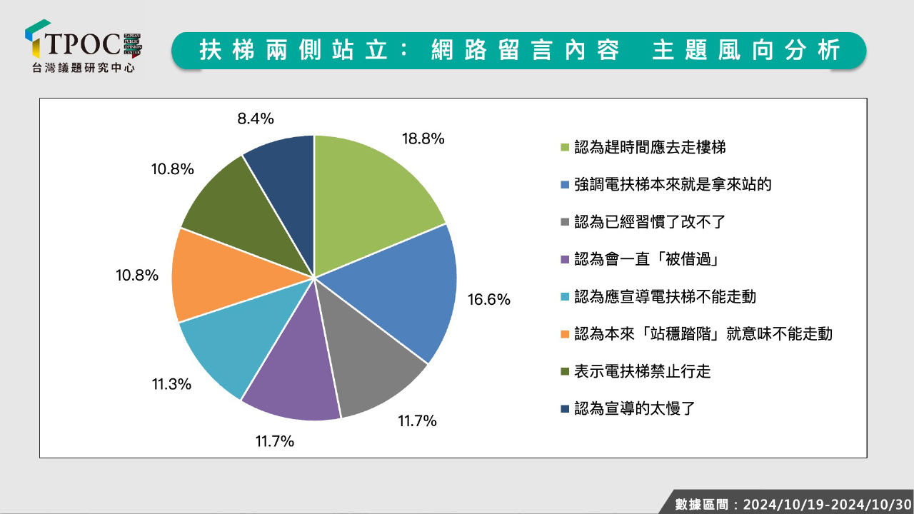 但,面對手扶梯站右邊還是站左邊這個「萬年議題」,為什麼網友們在討論時,會這麼激動呢?從網路留言內容主題風向分析結果觀察,儘管仍有網友傾向支持舊習慣,但網路上仍以支持北捷政策的言論佔上風。其中,直指「趕時間應去走樓梯」的相關言論聲量佔比高達18.8%最高,強調「電扶梯本來就是拿來站的」的相關說法也佔了16.6%左右,雖然還是有11.7%的聲量認為「右邊站立、左邊走路」已成習慣改不了,以及另外11.7%指出「若站左邊,會一直『被借過』」,但並未獲得多數網友認同。此外,還有11.3%的聲量力主該「宣導電扶梯不能走動」,10.8%指出本來廣播「站穩踏階」就意味著不能走動,10.8%重申「電扶梯禁止行走」,還有8.4%認為北捷「宣導的太慢了」。
