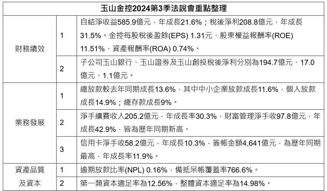 玉山金前3季股東權益報酬率(ROE) 11.51% 法說會重點一次看