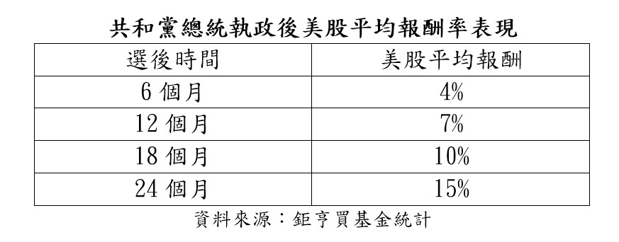 根據「鉅亨買基金」投資研究部統計,回顧自1945年以來的19次美國總統選舉後美股表現(採標普500指數),當共和黨總統執政且掌控參眾兩院時,美股通常呈現穩定成長趨勢。選後6個月、12個月、18個月和24個月的平均報酬率分別為4%、7%、10%和15%。隨著大選不確定性散去,美股後市可望看漲。