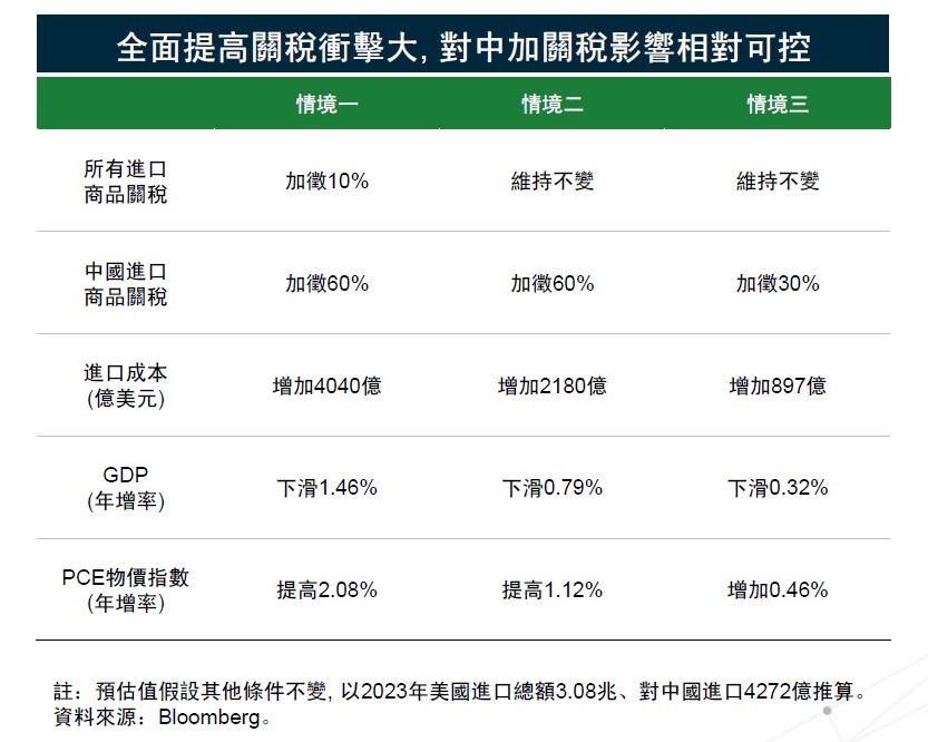 保德信市場策略團隊主管葉家榮指出,由於政黨輪替將引發部分的政策替換,市場擔心過往川普政策較為積極,可能會大幅改變目前政策現況,例如川普主張減少富人稅與個人稅、計畫取消綠能減稅補貼並轉向支持傳統能源、提高進口關稅,特別是將中國關稅提升至60%,以及嚴格限制非法移民等措施,因此,預期將造成短期市場波動。