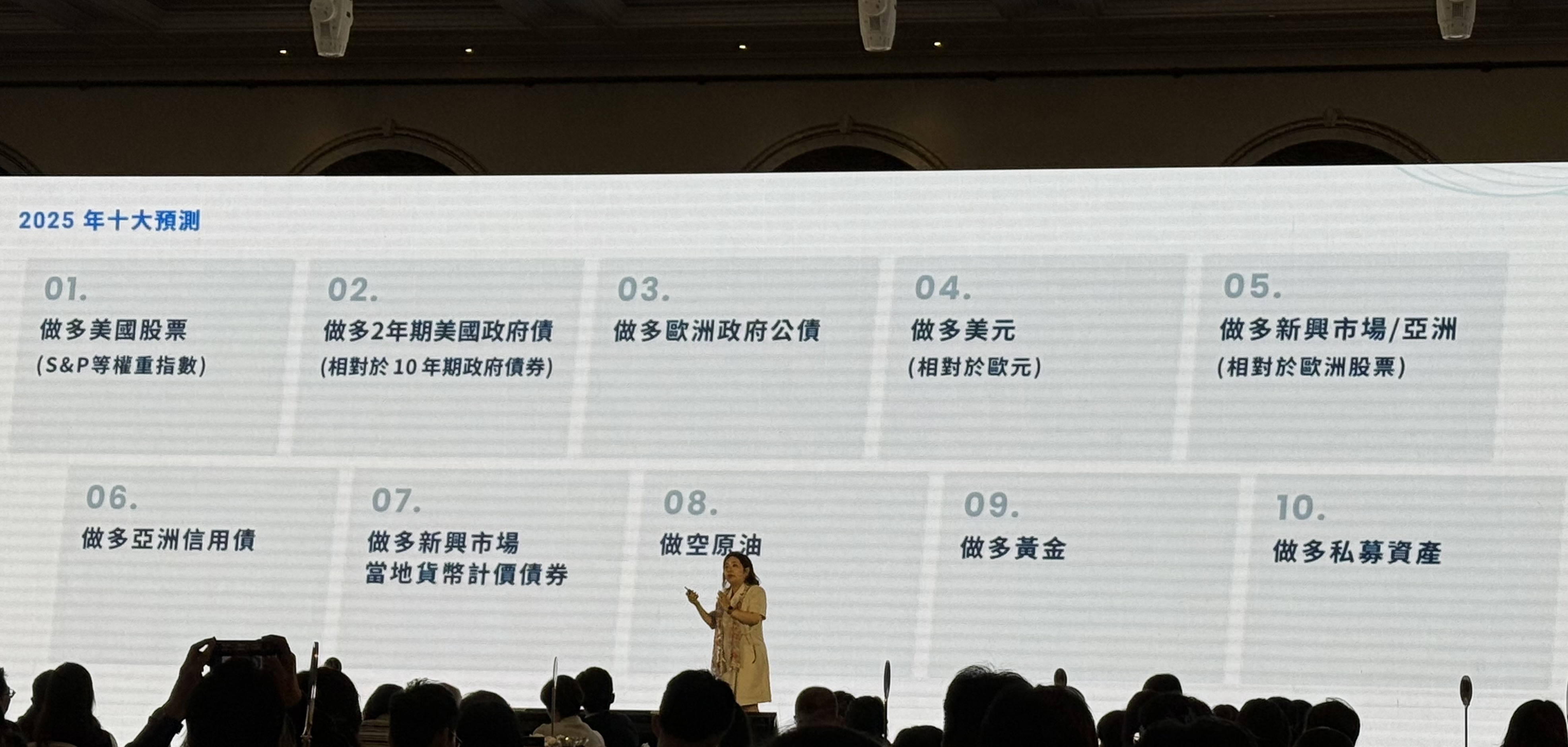 展望2025年,近藤敬子指出,美股、亞洲以及新興股市表現值得期待,建議做多美國股票(S&P等權重指數),因為不管新總統的政策走向如何,不可能實施貨幣緊縮政策,美國經濟應會軟著陸,對美股有利,投資人不妨承受風險、追求報酬機會,較看好大型權值股。