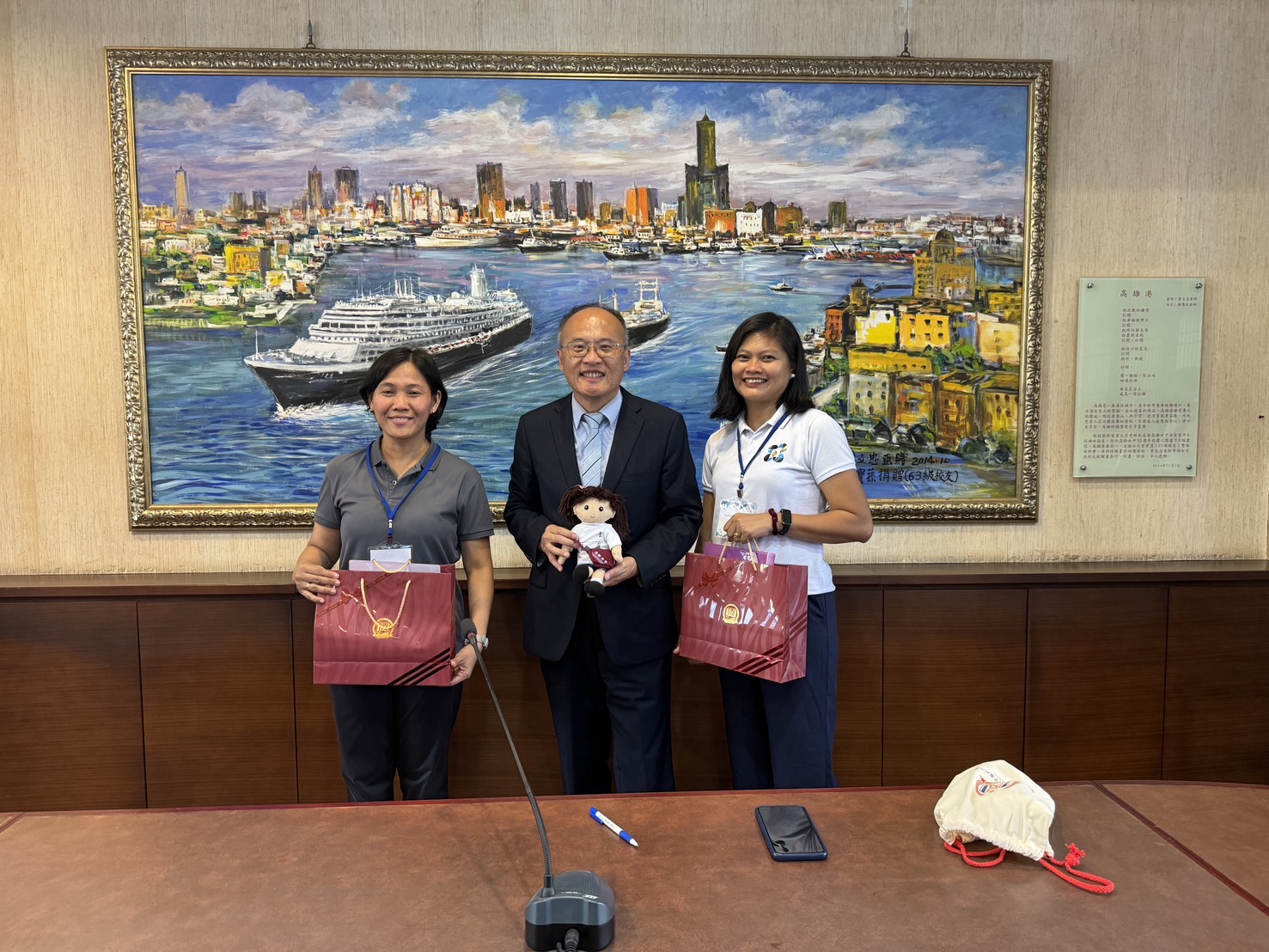 圖說:鄭文儀(中)致贈菲律賓高中師生雄女娃娃。(圖片來源:高雄市教育局提供)