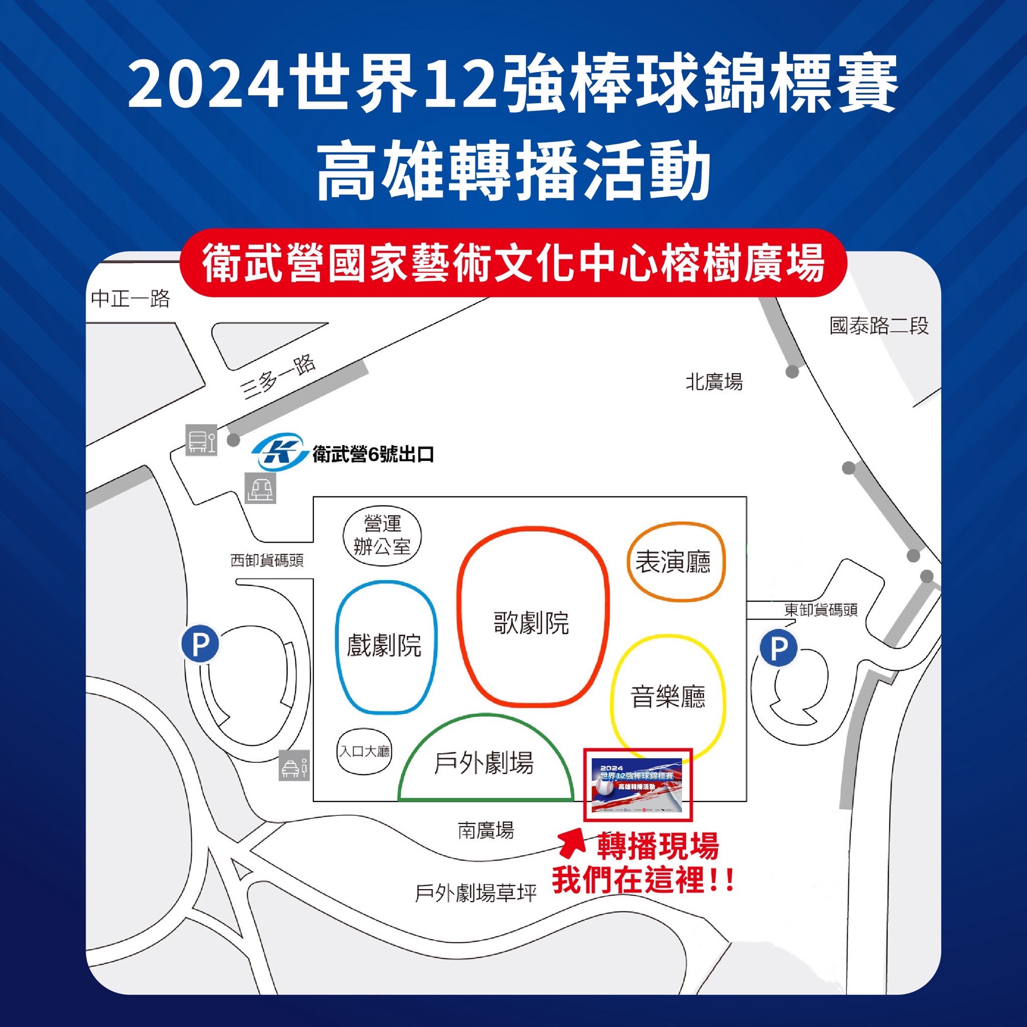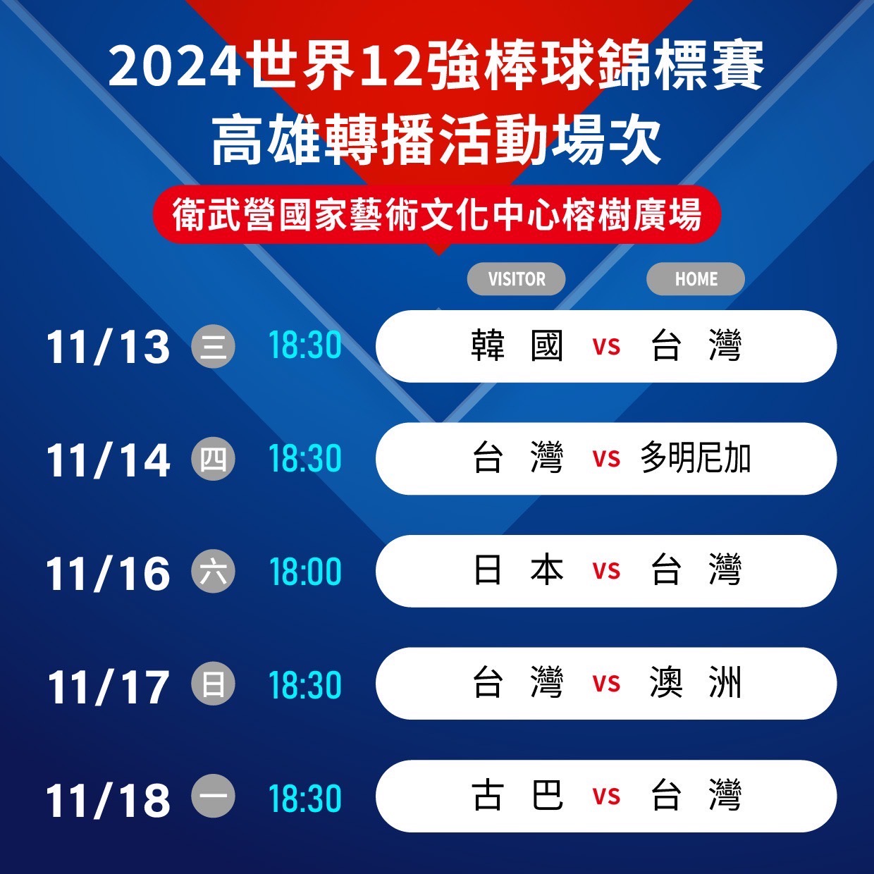 此次活動由衛武營國家藝術文化中心提供場地,並獲得賽事官方行銷單位悍創運動行銷公司、官方贊助台灣運動彩券股份有限公司、以及台鋼雄鷹棒球隊的大力支持,攜手推廣棒球運動。現場將設置400吋大螢幕同步轉播比賽,並有街頭藝人表演和互動遊戲活動。高雄市政府熱情邀請大家從11月13日起到衛武營共同觀賽,為台灣隊熱血應援,助力台灣隊爭取晉級東京巨蛋複賽的機會!