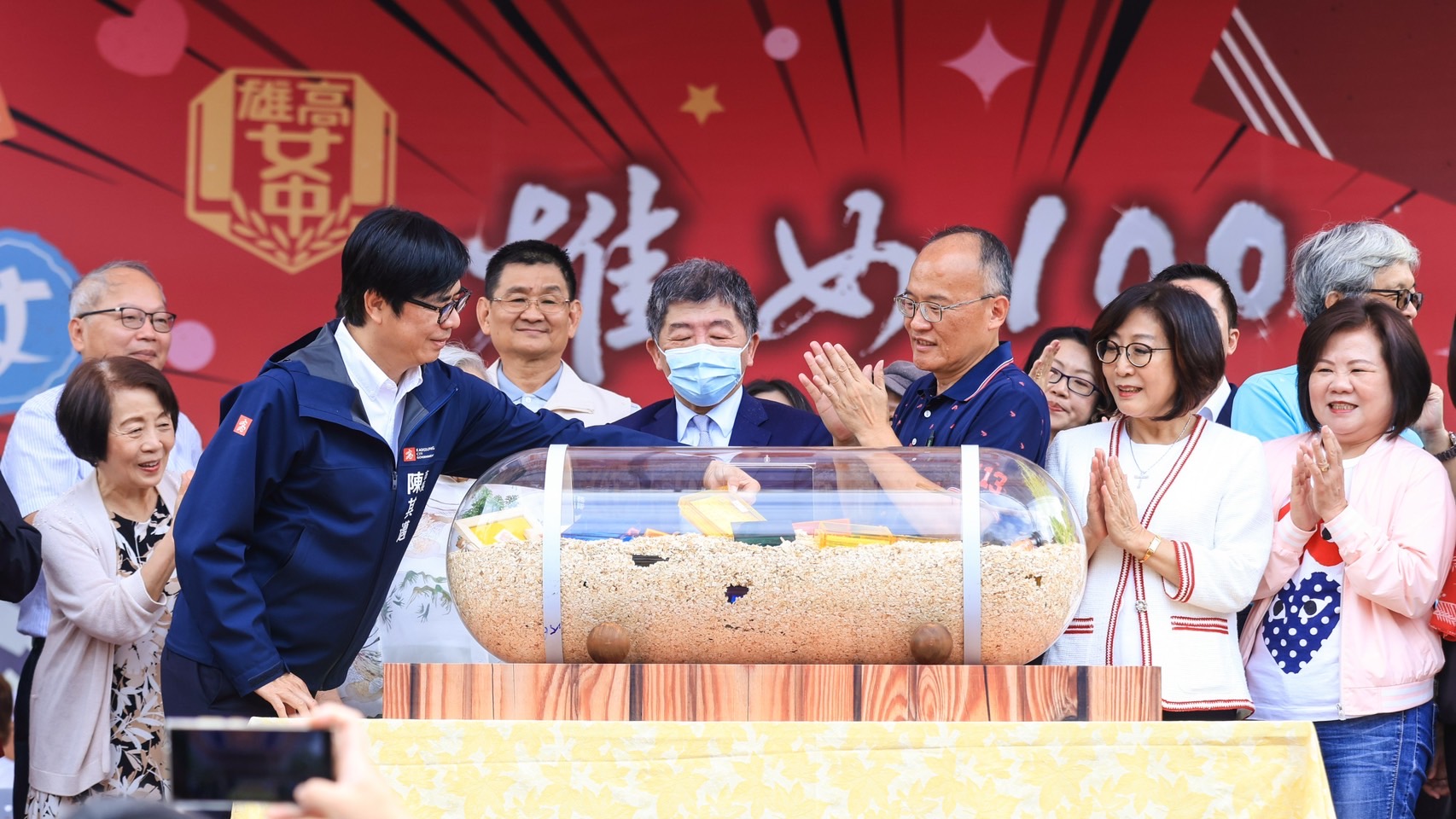 現場陳其邁也與師生、與會嘉賓寫下祝福祈願卡,放置於時空膠囊,並相約30年後再次開啟,伴隨著生日快樂歌曲,行政院政務委員陳時中今日也以家人角色,陪同百歲校友孫陳錦境參與盛會,大家共同切下蛋糕,共同見證意義非凡時刻,氣氛溫馨動人。
