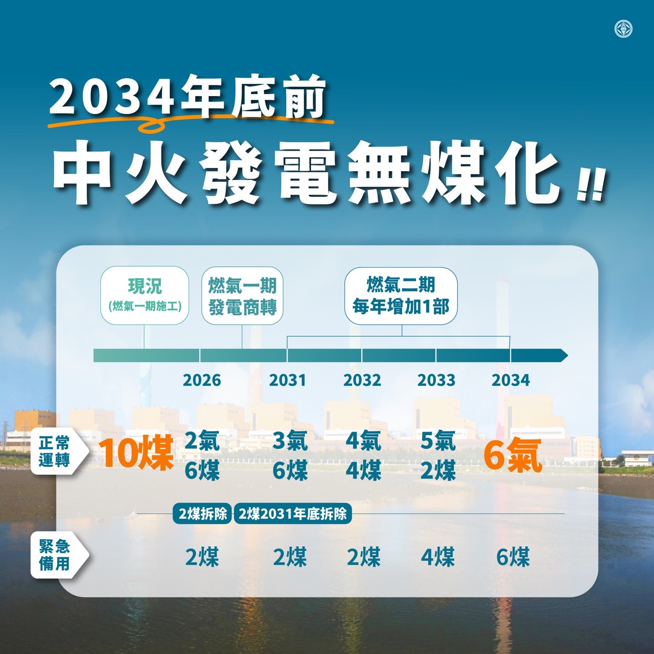 2034年第四部燃氣機組上線,同年底燃煤9號機、10號機除役轉緊急備用機組。