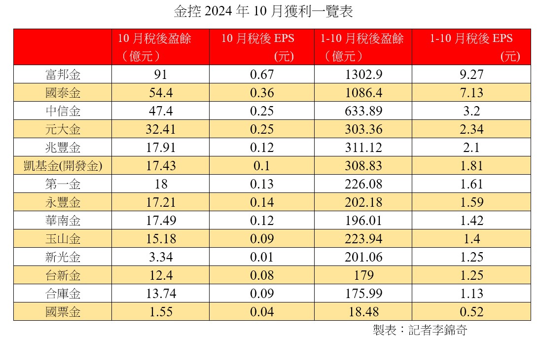 金控10月暨前10月獲利出爐!富邦金10月稅後獲利91億元,創歷年10月新高,累計前10月稅後淨利1302.9億元、EPS高達9.27元,穩居金控獲利王;國泰金10月稅後獲利54.4億元,累計前10月稅後淨利1086.4億元、EPS也衝上7.13元,累計稅後淨利及EPS皆創歷史次高紀錄,穩居金控獲利亞軍。