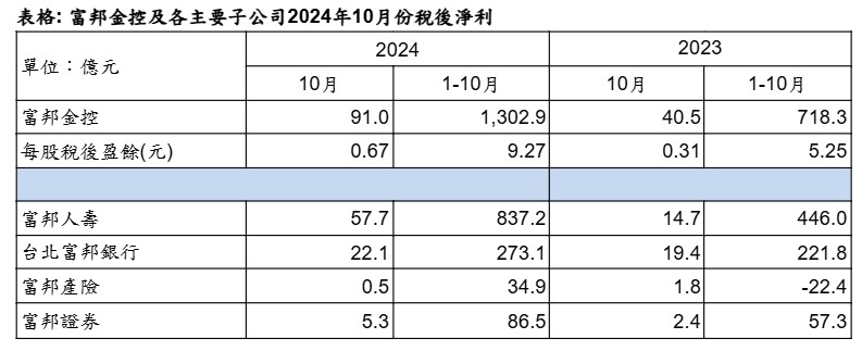 子公司富邦人壽、台北富邦銀行、富邦證券10月獲利,亦創歷年10月新高紀錄,台北富邦銀行、富邦證券累計前10月獲利皆續創歷年同期新高。