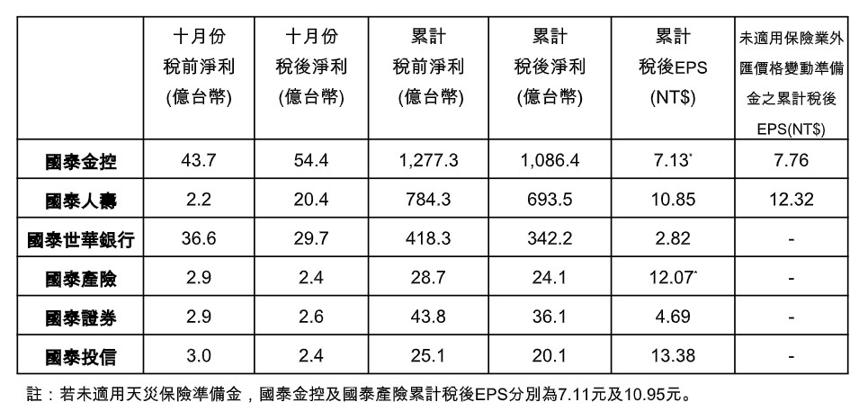 10月稅後淨利54.4億元,累計稅後淨利1086.4億元,EPS達7.13元,累計稅後淨利及EPS皆創歷史次高紀錄。