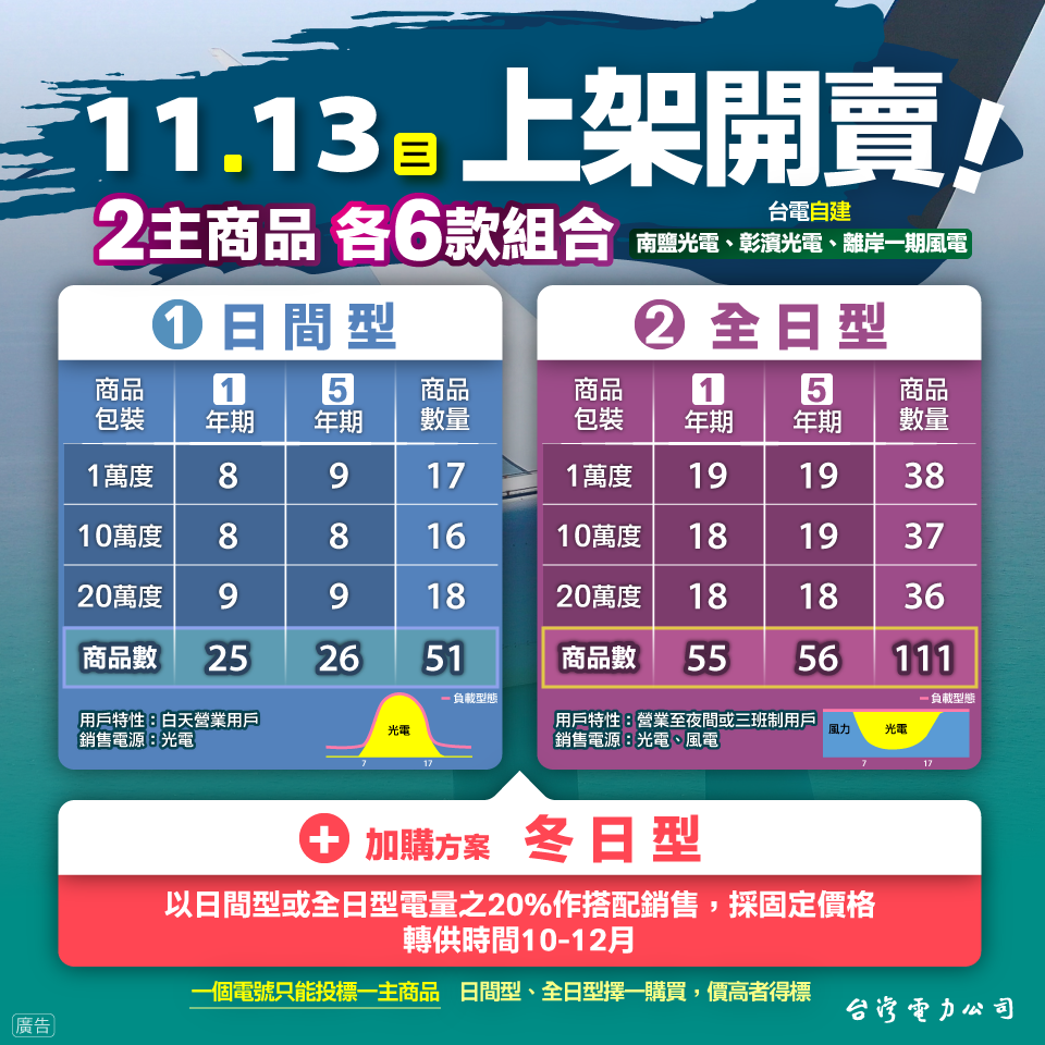 台電表示,去(112)年首度以南鹽光電與彰濱光電等自建光電案場所發綠電為標的,開賣小額綠電。今年擴大銷售範圍,納入台電自建離岸一期風電。由於風電加入銷售陣容,台電考量風、光綠電的發電特性,並針對不同用戶的用電時段差異,再搭配不同年期,設計出2種主商品、各6款組合。
