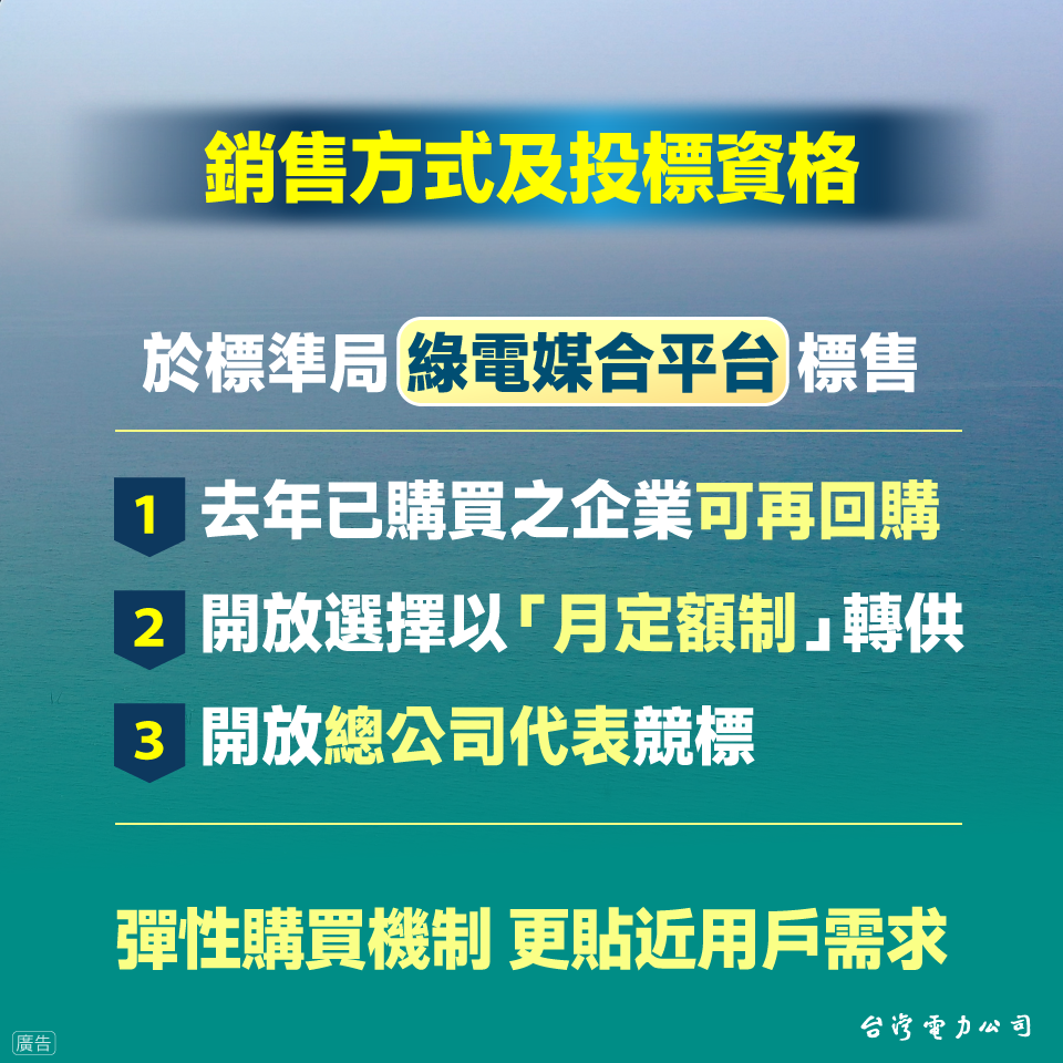 此外,部分用戶轄下有分支機構,依各機構規模自行採購小額綠電不符效益,因此今年台電也開放總公司代表投標,得標後可將想分配的分支機構的電號清單提供給台電,經資格審查後,便可將所購綠電分配給轄下分支機構使用。