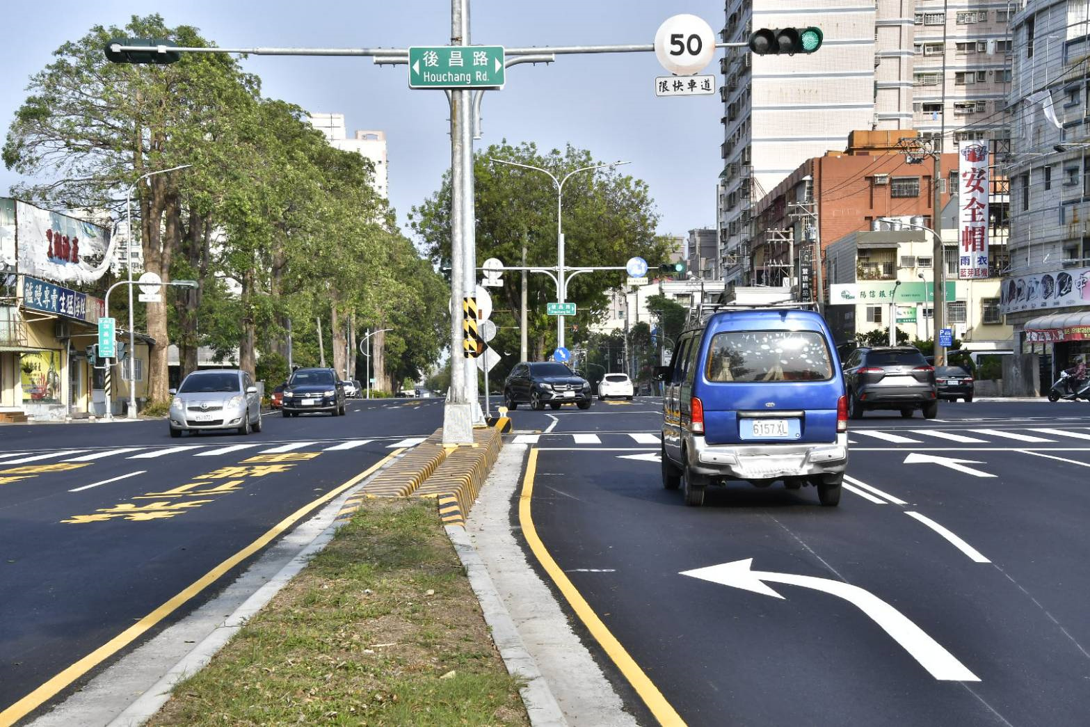 ↑圖說:透過調整車道寬度、削減分隔島、設置左轉專用道、擴充待轉空間及重新鋪設路面等方式,提升後昌路至軍校路路段行車安全。(圖片來源:高雄市工務局提供)
