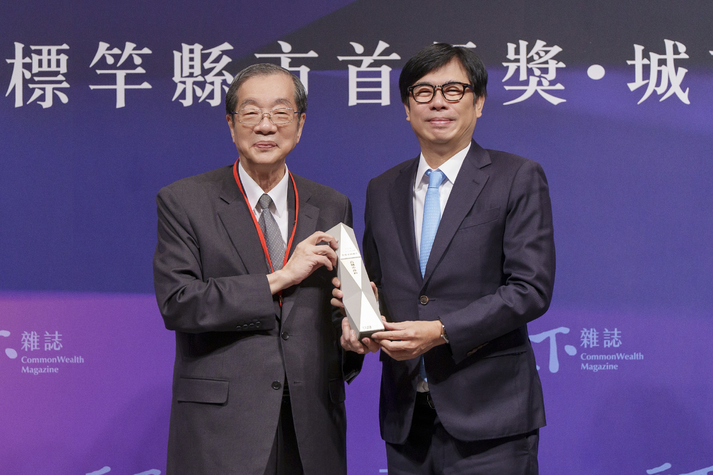 ↑圖說:前考試院長黃榮村帶領評審團隊負責本次天下城市治理卓越獎評選工作,陳其邁市長從其手中接過年度卓越城市獎獎項。(圖片來源:高雄市政府提供)
