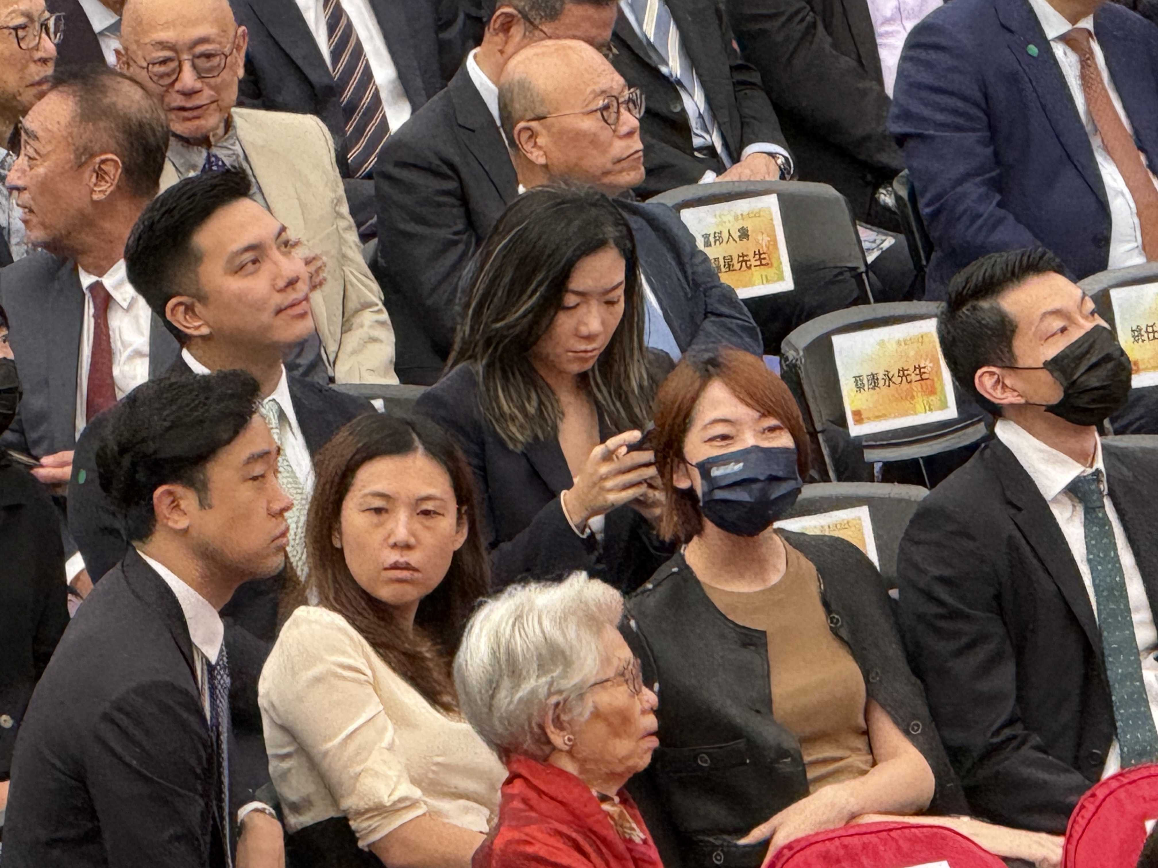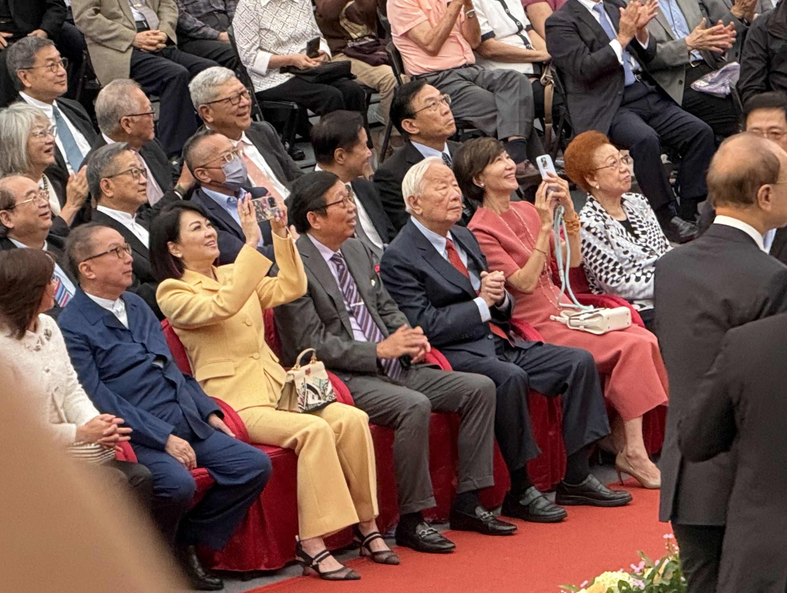 臺灣大學今日舉行96週年校慶,典禮中由臺大校長陳文章頒授蔡明忠名譽博士學位,蔡明忠的母親蔡楊湘薰、妻子陳藹玲(如上圖,富邦集團提供),以及兩位女兒、長子蔡承道夫妻,以及富邦金控董事長蔡明興夫妻等家族成員,均出席觀禮,並且不忘拍照記錄這光榮時刻(如下圖,記者李錦奇攝影),富邦集團高階主管也到場觀禮。