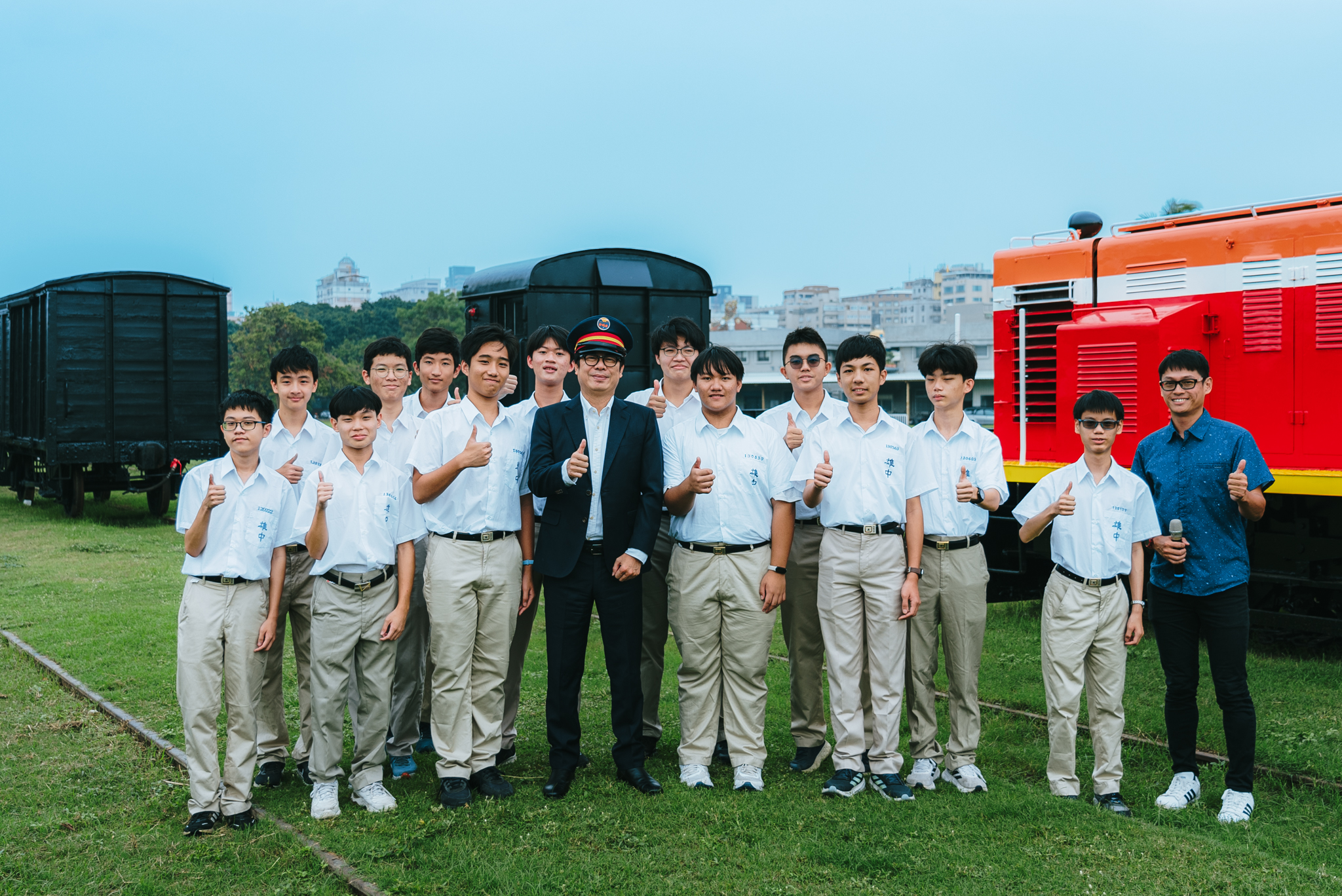 ↑圖說:市長、古庭維館長與雄中鐵道社社員們於「台糖調動機HR-30C型13」(常被稱為「大日立」)前合影(圖片來源:高雄市文化局提供)