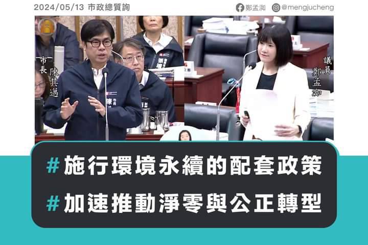 鄭孟洳除了攸關市民日常生活的民生議題,對城市淨零也非常重視。她認為淨零是世界潮流,也是中央推動的重要目標,市府內部有永續推動小組,但目前的政策推動仍以環境面向為主,她著眼於推動淨零後續會受到影響的傳統產業?該如何協助這些產業和勞工的轉型或轉業?以避免出現倒閉潮,影響勞工就業權益。
