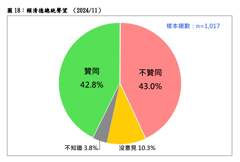 綜上,最新民意顯示,二十歲以上台灣人中,42.8%贊同賴清德總統處理國家大事的方式,43%表達不贊同,14%表示沒意見及不知道。不贊同者比不贊同者多 0.2 個百分點。也就是說,上任近六個月,不贊同賴清德總統領導國家方式的人已略超過贊同的人
