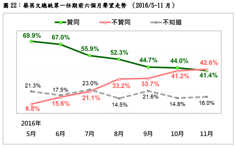 有趣的是,游盈隆指出,如果比較賴清德和前總統蔡英文第一任期前六個月的聲望趨勢,可以發現兩者竟然相當雷同。兩人都是在 11 月開始陷入「執政困境」,拿不到多數民意的支持,蔡英文當時甚至曾面臨一連九個月的執政困境。