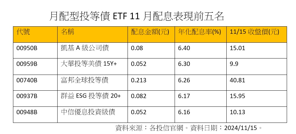 也就是說,11月的月配投等債ETF殖利率,已有兩檔擠進11月月配商品前五強,包括凱基A級公司債(00950B)的年化配息率6.4%,以及大華投等美債15Y+(00959B)。