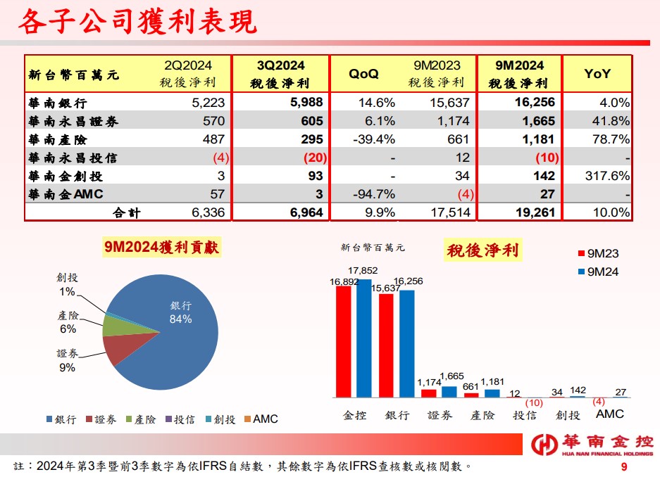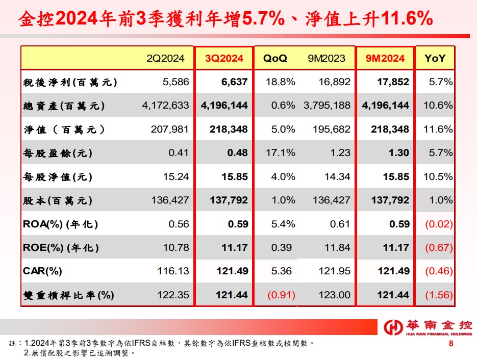 子公司華南銀行前3季自結稅後淨利162.56億元,年增6.19億元或4%,主要係金融商品投資(含兌換)收益增加28.38億元、手續費淨收益增加24.96億元、利息淨收益減少13.82億元,以及呆帳淨提存增加18.47億元所致。