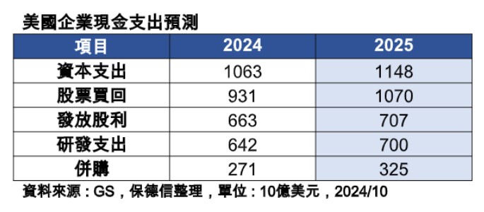 美股今年漲幅超過兩成,展望2025年,法人看好美國企業盈餘成長仍將維持高速成長,整體預計超過15%成長幅度,而研發支出占比,也已回到疫情前的水準,資本支出與股票買回的持續成長,加上AI需求增加,預料將成為明年美股多頭最大的支撐力道之一。