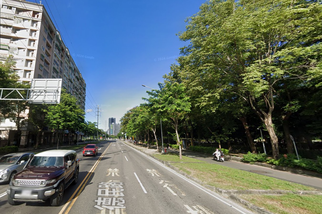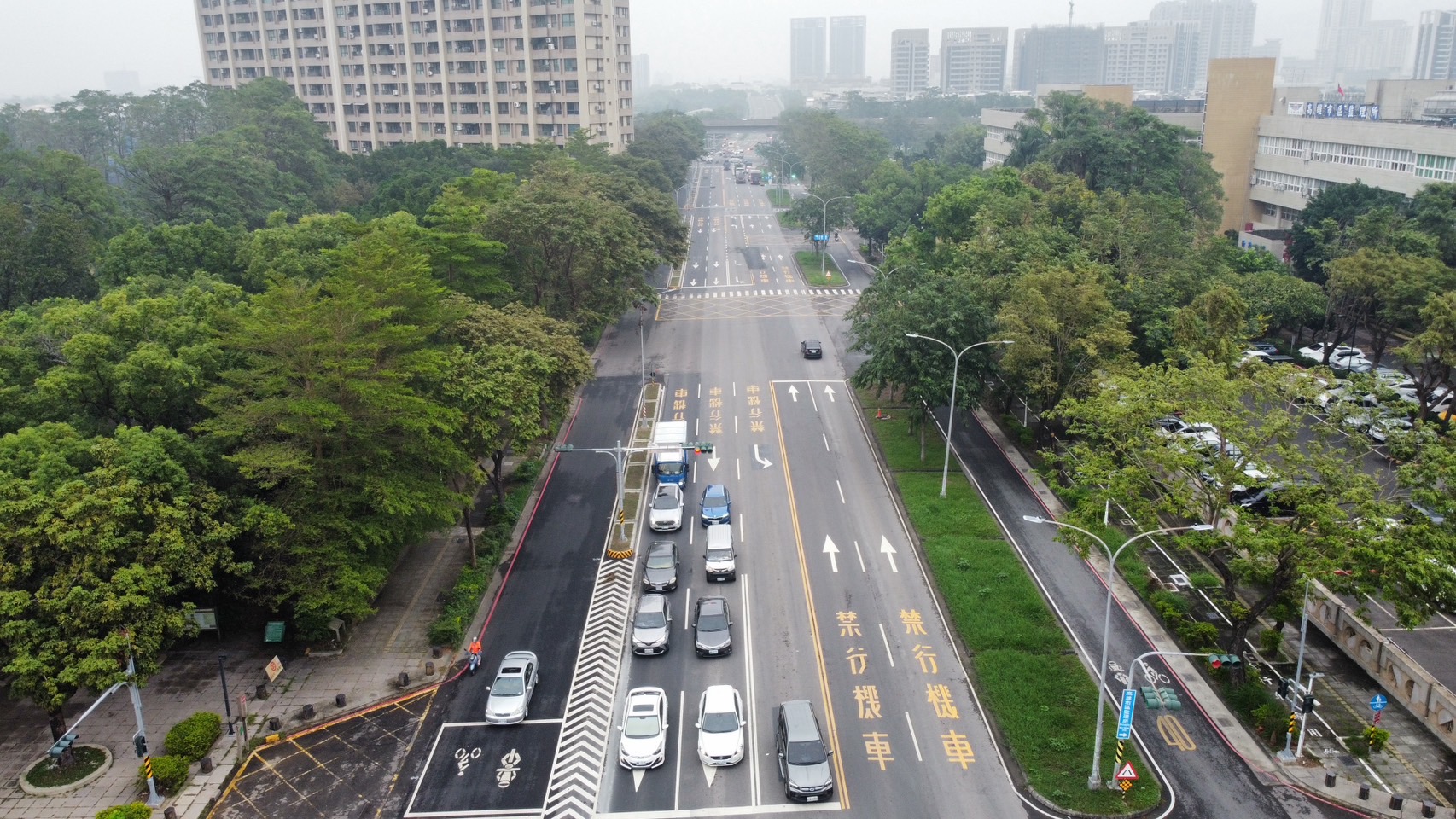 ↑圖說:分隔島瘦身後,除調整快車道新增左轉車道外,也增加慢車道寬度,降低大型車輛與機慢車爭道風險。(圖片來源:高雄市工務局提供)