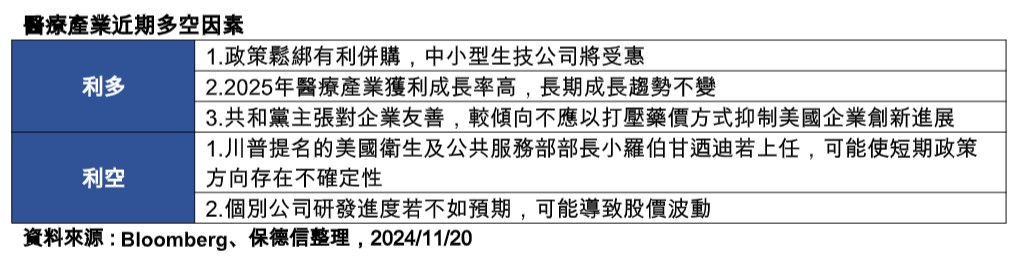醫療產業類股近期出現一波急殺,法人指出,主要是市場對川普醫療政策的不確定性產生疑慮,特別是川普提名反疫苗派人士:小羅伯甘迺迪,出任衛生部長,進一步加劇市場不安的「川普亂流」,再加上短期公債利率上升所致。展望後市,保德信指出,醫療生化產業整體成長性並未改變,在基本面維持不變的情況下,建議採取分批布局方式,不僅能分散風險,同時亦能掌握未來股價上漲機會。