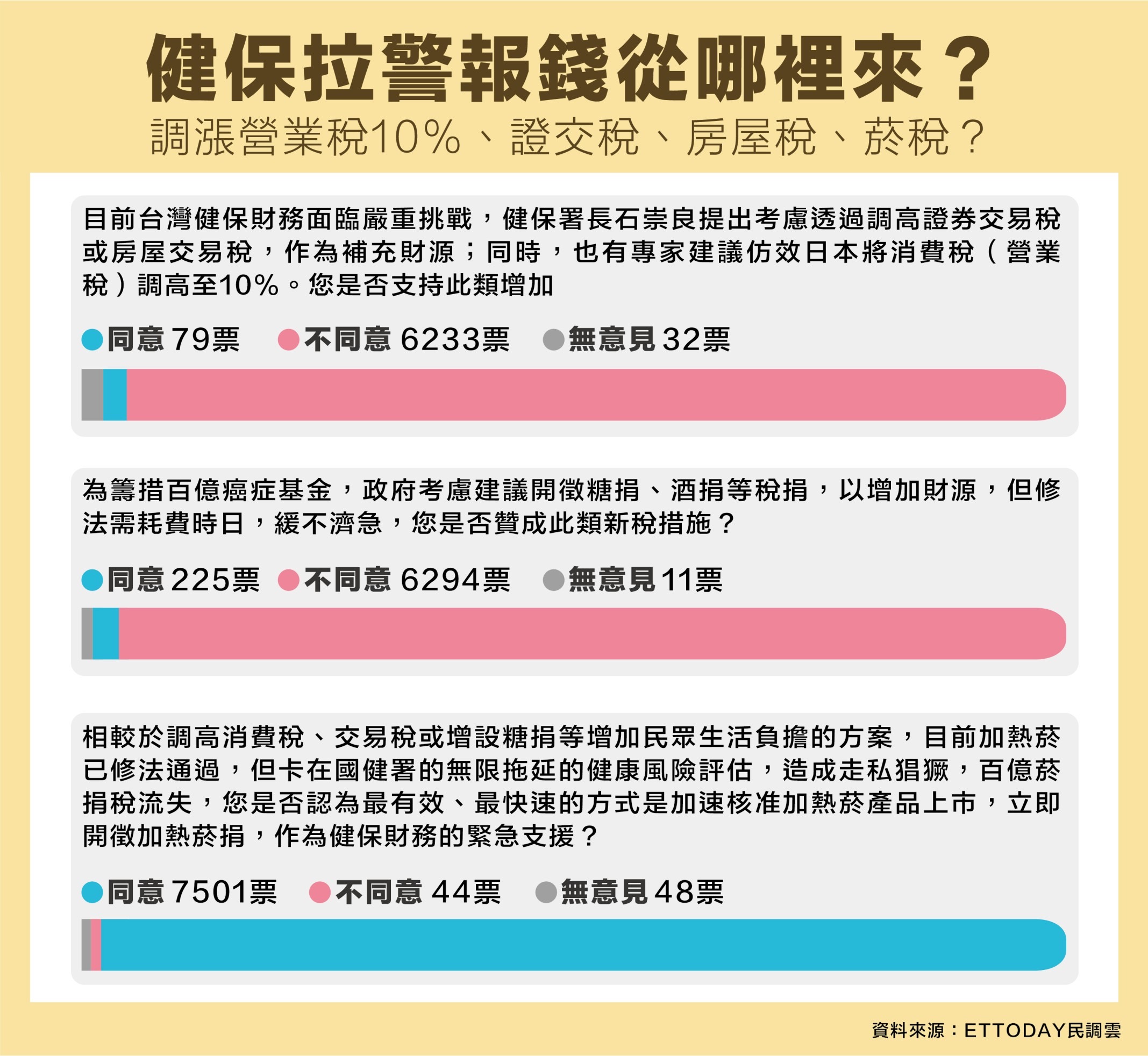 健保資金亮紅燈,健保署長石崇良提出要加徵證交稅、房屋交易稅,甚至擬將營業稅從現行5%提高到10%挹注健保,您會同意嗎?《ETtoday新聞雲》以網路投票方式即時調查,投票時間從11月18日至11月20日,對於「調高證券交易稅」或「房屋交易稅」、「營業稅漲10%」、「開徵酒捐或糖捐」四種挹注健保財源,民眾均高度反對,一面倒要求政府盡快開放加熱菸依法上市,讓一年超過百億的菸稅能挹注健保。