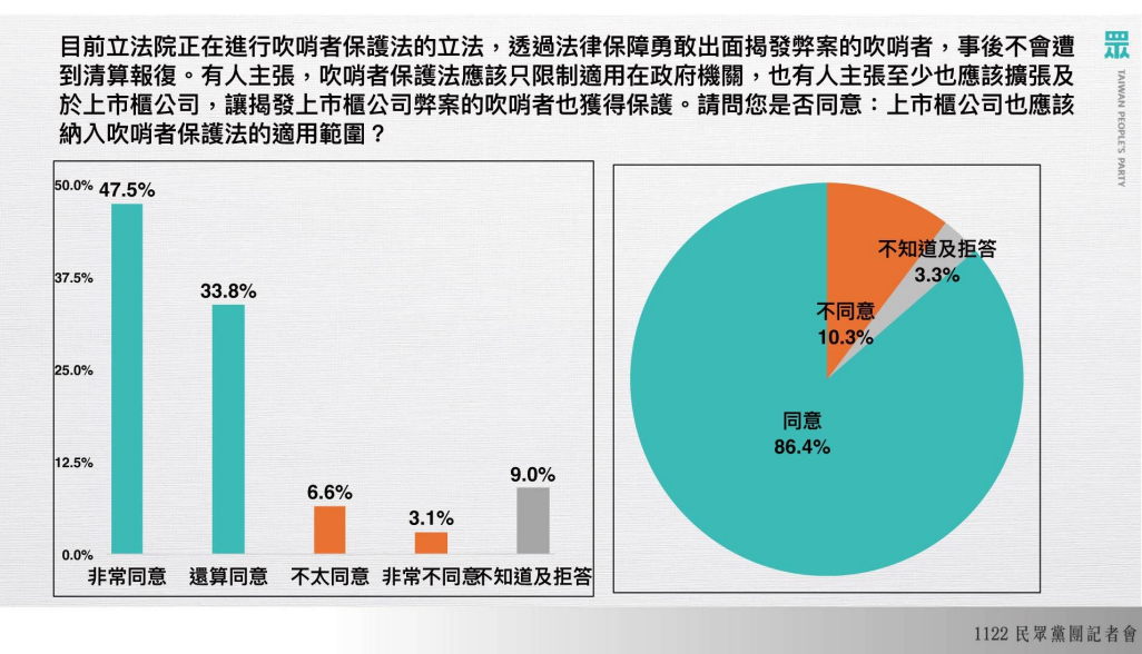 黃國昌現場拿出民眾黨民調中心的民調數據論證,指出目前台灣民眾對公益揭弊者保護法立法,不分黨派支持、年齡層、教育程度,支持立法的支持度幾乎都突破八成,民進黨支持者的支持度更高達八成三,若從教育程度來看,高中高職、專科大學和研究所以上,同意比例也都達八成以上,是壓倒性的結果。