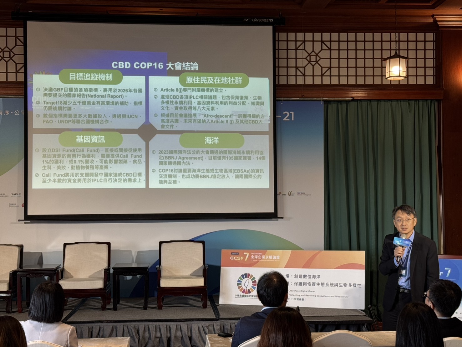 台達電子文教基金會執行長張楊乾從企業責任角度出發,探討如何建立有效的海洋保育模式,分享台達基金會在海洋保護中的實踐案例,尤其在與非政府組織、政府機構合作上所做出的努力;國立臺灣海洋大學海洋生物研究所講座教授邵廣昭是海洋保育的倡導者,分享《海洋保育法》下企業如何參與永續行動,並在國家法制的框架下對企業參與海洋保育的規範與指導,鼓勵企業投入資源支持海洋保護,從而實現更有效的保護措施。