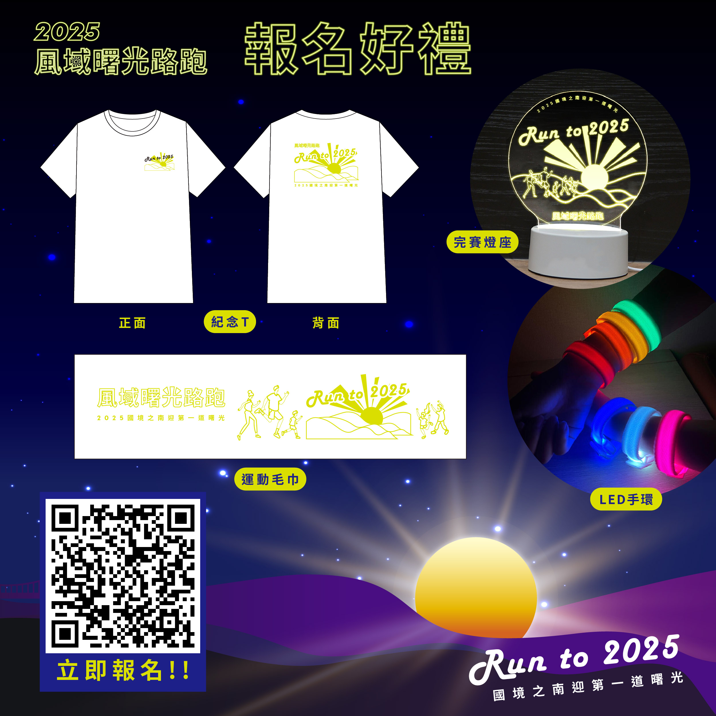 交旅處說明,報名即送豐富好禮,以「光」的元素呈現報名紀念衣、LED手環、運動毛巾及最吸睛發光小立燈座獎牌,呼應活動從夜光跑到曙光,更象徵著迎向未來的希望之光,打造專屬於曙光跑者的獨特標誌。