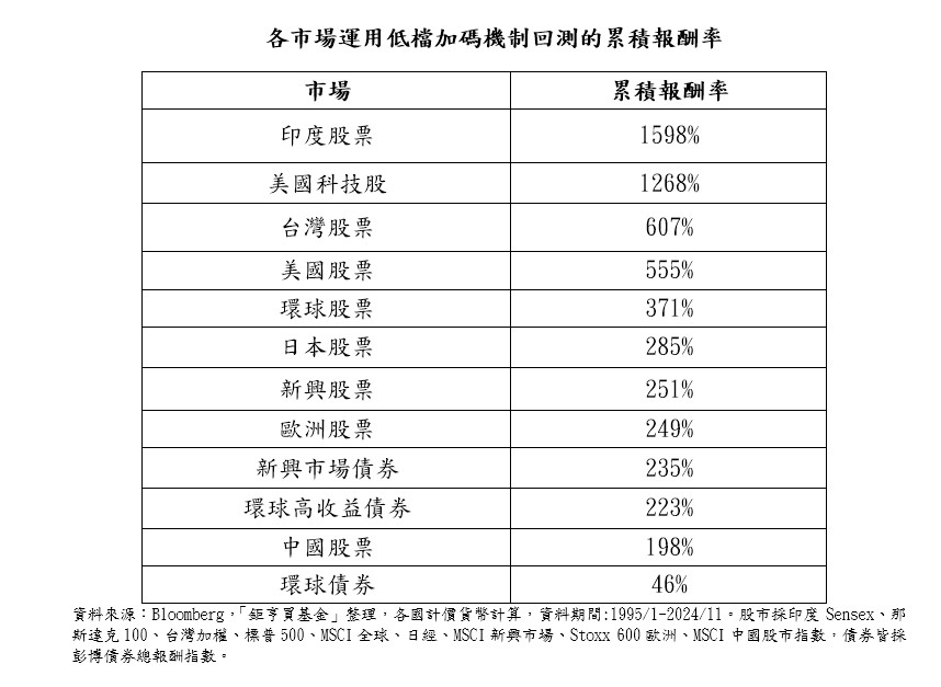 此外,近期印度股市雖出現大幅度修正,但「鉅亨買基金」表示,印度SENSEX指數明年前三季度預估盈餘年增率分別為35%、38%、48%,前景可期,目前正是逢低撿便宜進場時機,加上印度股市具高波動和高成長的特性,成為超底王策略的理想應用場域。從回測數據來看,印度股票表現最佳,累積報酬率達到1598%;整體看來在高波動且長期上升的市場中,超底王策略能夠取得顯著的回報。