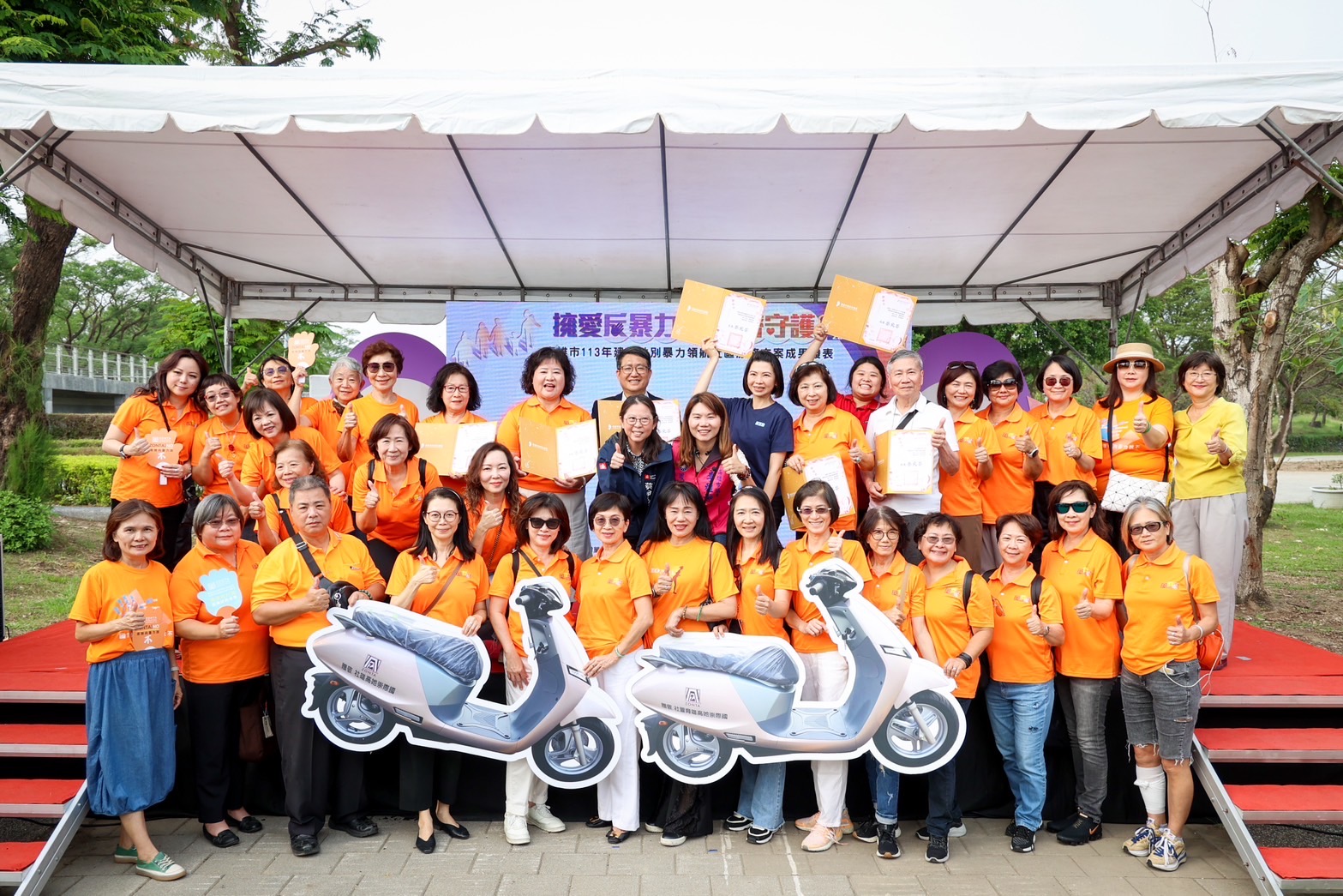 高雄市社會局家防中心23日在衛武營都會公園的夏日大道,舉辦「擁愛反暴力 鄰里齊守護」113年度國際終止婦女受暴日宣導暨建構性別暴力領航社區服務方案成果發表活動,國際崇她高雄社及國際崇她高雄育萱社集結8個善心企業組織,也捐贈10台「保護救援服務」電動機車,讓社工能及時提供各項服務。
