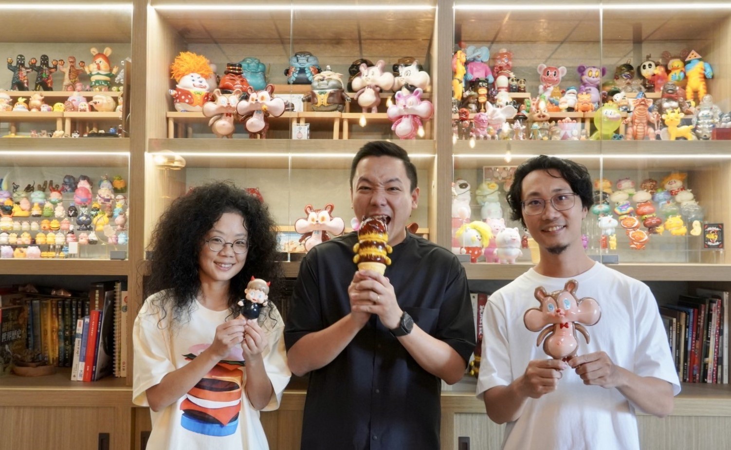 ↑圖說:青年局長張以理(中)親訪高雄潮流玩具工作室「AKSOULMUCH」,與負責人夫婦Aalis和Kenneth交流IP角色設計構想及產業現況。(圖片來源:高雄市青年局提供)