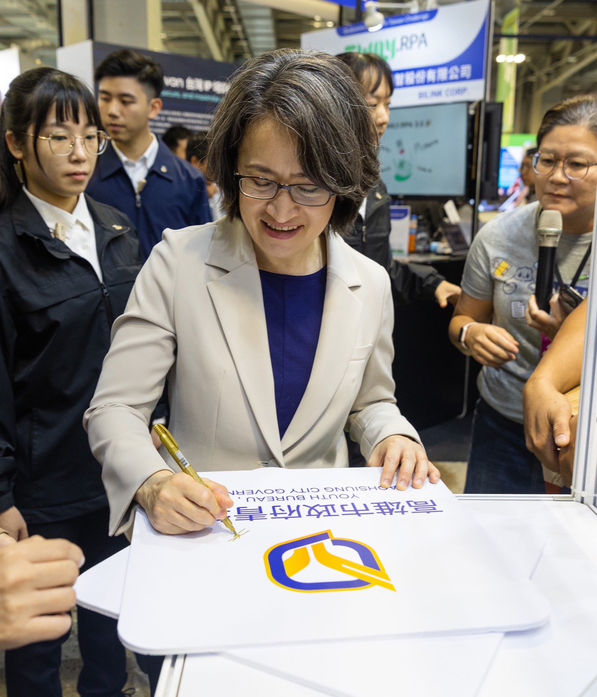 ↑圖說:副總統蕭美琴參訪高雄青創館展區,並於青年局手舉牌上簽名,展現對青年創業的支持與鼓勵。(圖片來源:高雄市青年局提供)