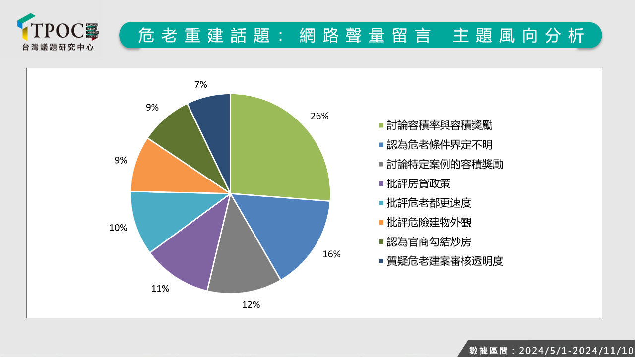 進一步分析網路留言主題風向,可以看到網友們對於危老重建議題的討論面向相當多元,其中,「容積率與容積獎勵」的話題討論度最高,聲量佔比高達26%,許多網友對於給予危老容積獎勵的政策表示不滿,認為這會增加社會成本,甚至質疑容積獎勵是「暴利」。其次,「認為危老條件界定不明」相關論戰佔比15%,經常討論危老重建與都市更新之間的差異。此外,有關「討論特定案例的容積獎勵」及對現行「房貸政策的批評」也分別佔比12%和11%,佔據討論風向的三、四名。其他討論焦點還包括「批評危老都更速度」、「批評危險建物外觀」、「認為官商勾結炒房」、「質疑危老建案審核透明度」等面向,各佔比約7%至10%之間,抱持負面觀點的話題相當多。