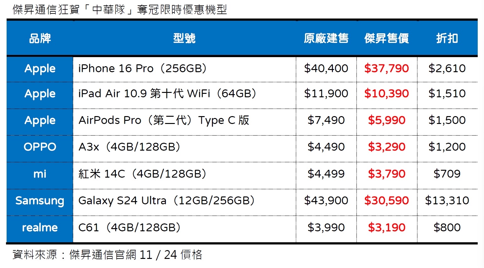 2024世界12強棒球賽,中華隊擊敗日本隊,勇奪冠軍,全台民眾嗨爆,各大業者也紛紛推出奪冠優惠活動慶祝,像是全台最大連鎖通訊門市:傑昇通信,宣布祭出配件買一送一,再加碼手機超殺優惠,自即日起至27日一連三天,iPhone 16 Pro(256GB)只要3萬7790元,結帳立省2610元;三星Galaxy S24 Ultra直降1萬3310元,以及多款免萬元手機,與全台民眾同歡。