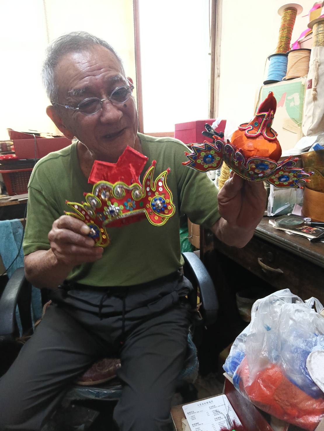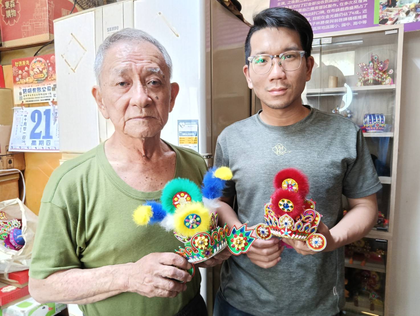 ↑圖說:蘇志榮獨子見兩老太辛苦,辭掉工作照顧他們,並從中學習父親純手工偶帽技藝,把技術傳承下來。(圖片來源:業者提供)