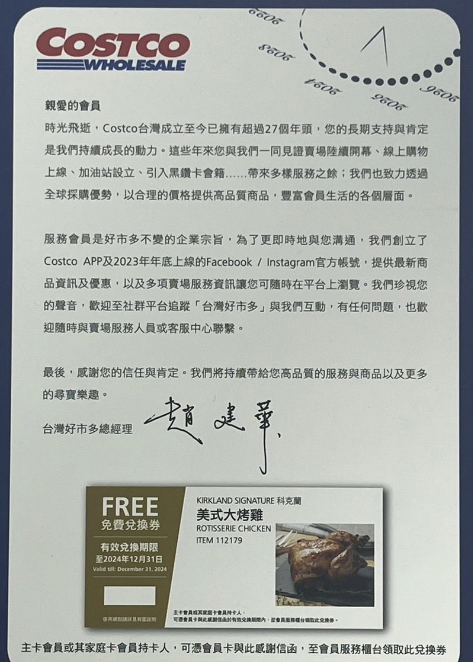 一位網友先前在臉書社團「Costco好市多 商品經驗老實說」PO文,開心分享收到今年「黑色購物週」檔期信函中的烤雞兌換券。昨起許多老會員留言分享,為了換烤雞,卻因黑五檔期一買不可收拾。